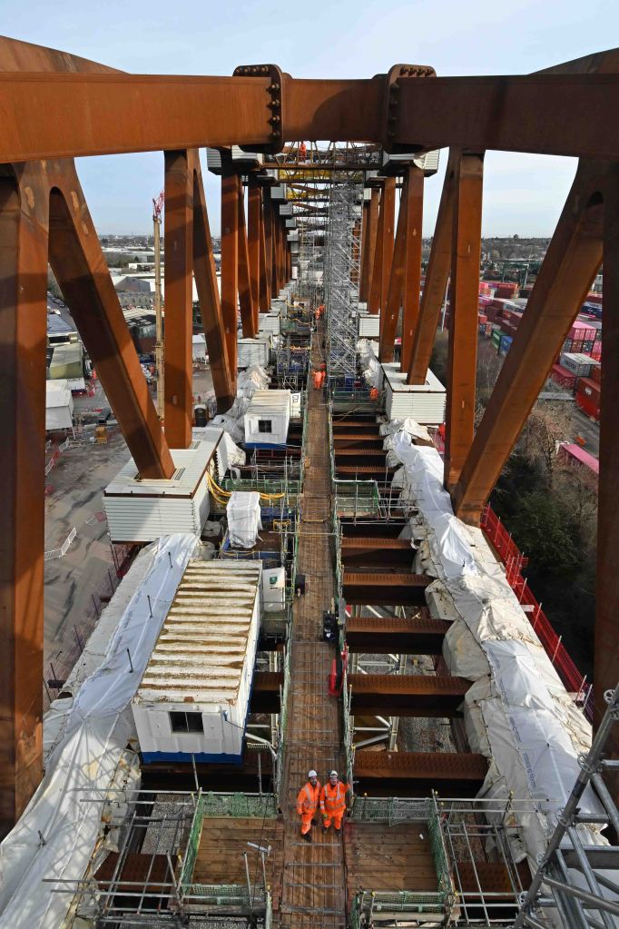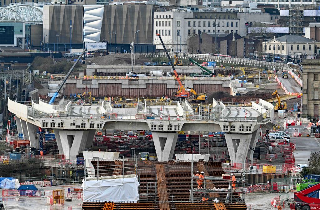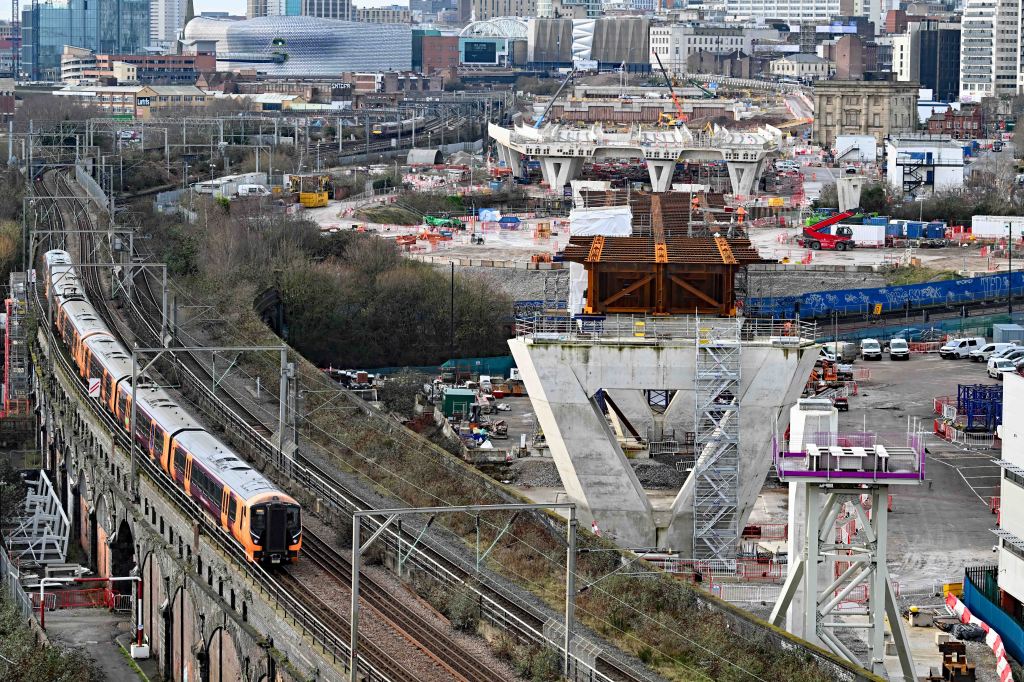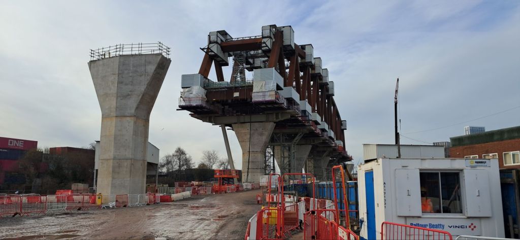 Looking down along the bridge from the high girders at the Birmingham end of the structure.The view looking the othe way towards Curzon St with a cross-city line train on the route the bridge will be pushed out over…A zoom lens shot of Curzon St station under construction.