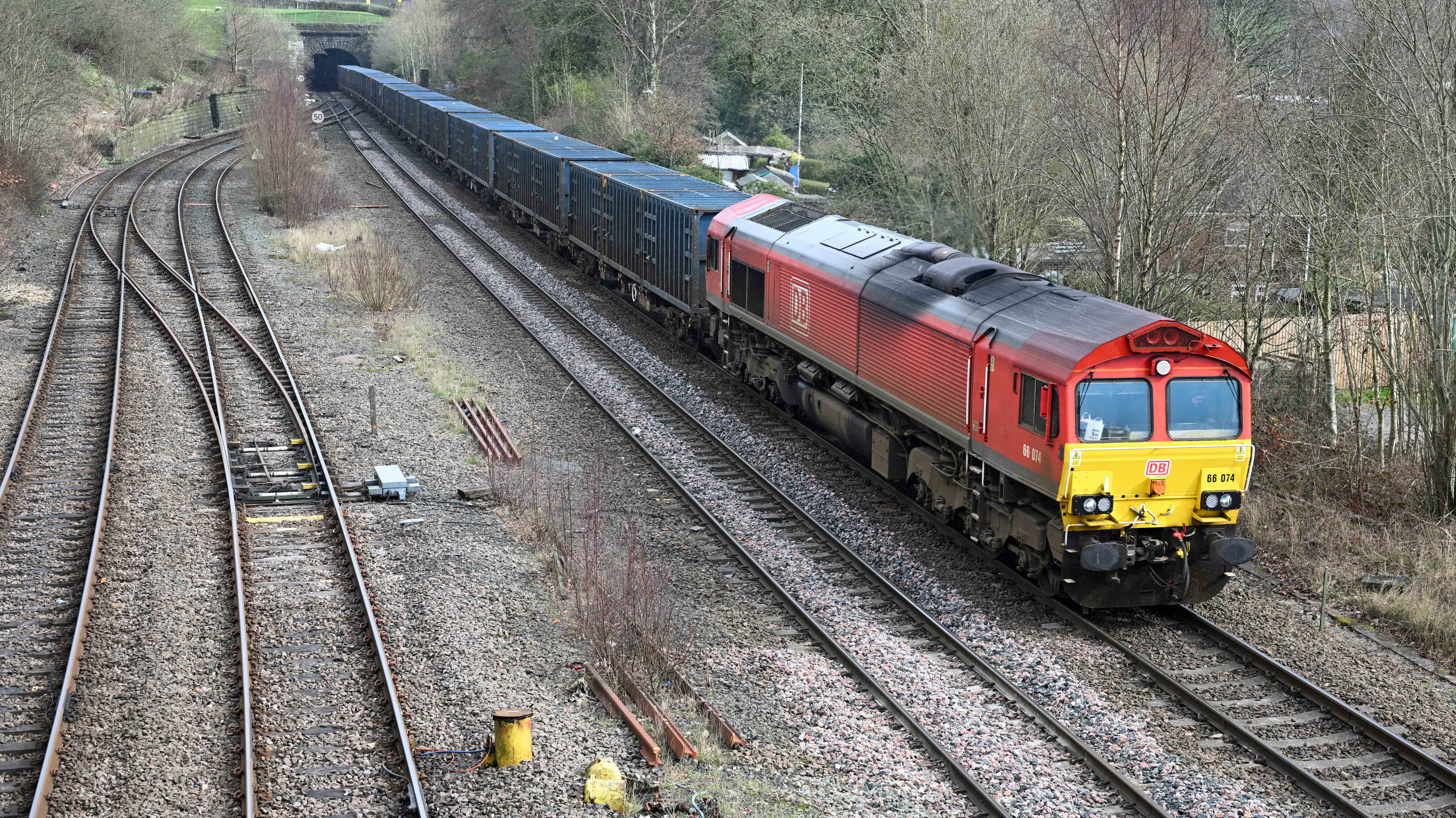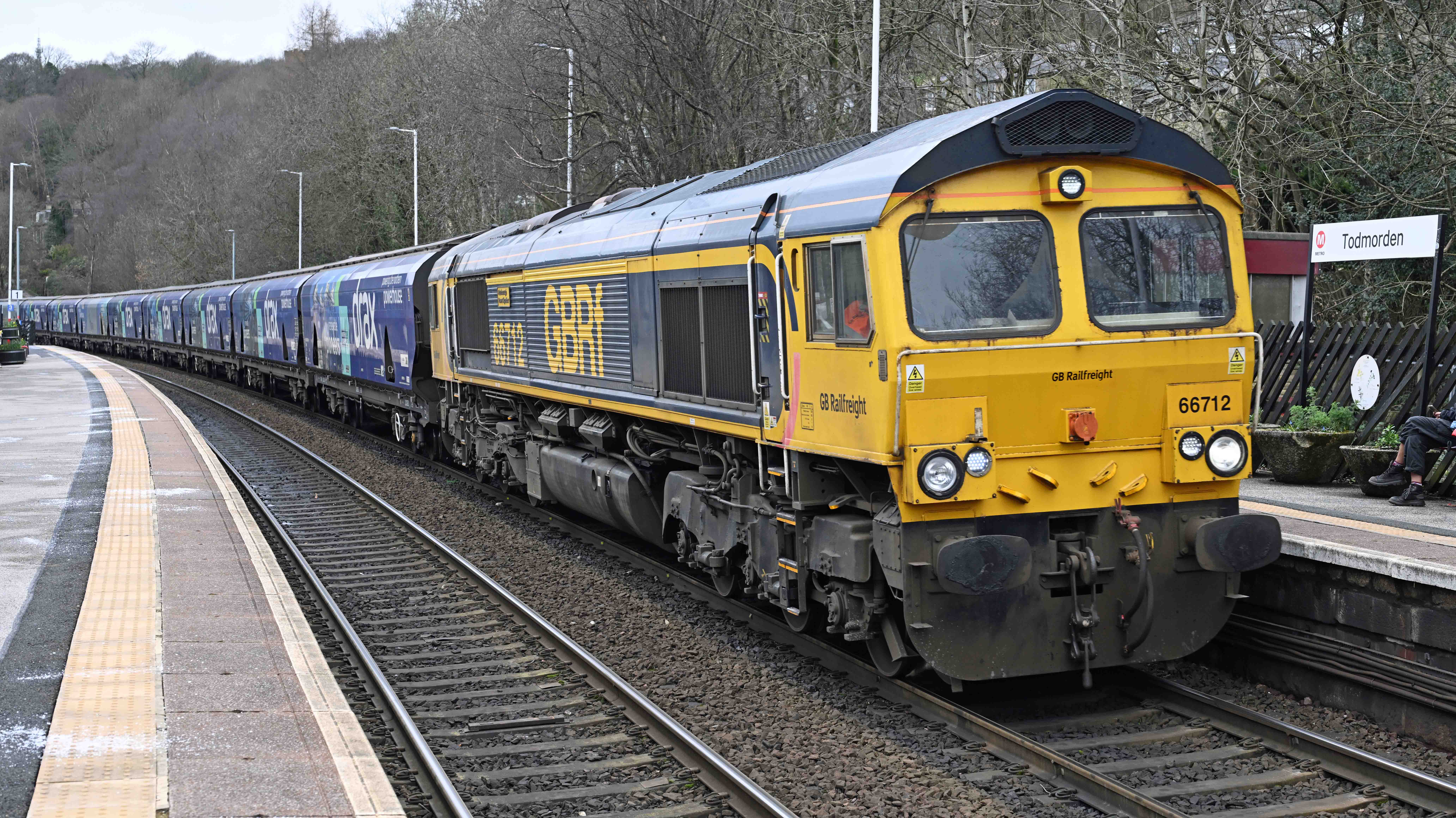 66712 thunders through Todmorden station with another load of biomass for Drax power station which has been imported from North America via Liverpool docks.Meanwhile, in the opposite direction, DB’s 66078 hauls the empty ‘binliner’ service from Wilton (Teeside) to Knowsley just outside Liverpool.