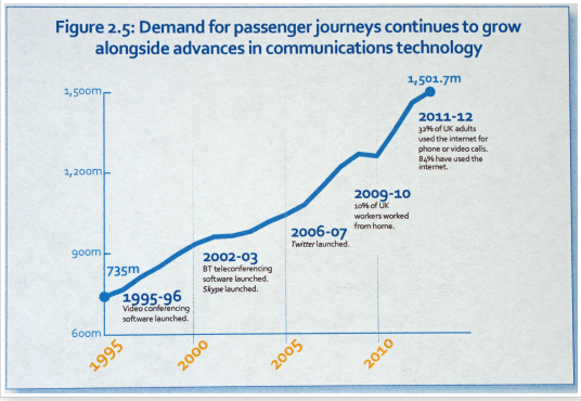 Mind you, the chart also exposes another of the anti Hs2 campaigns claims – that the internet, home working & teleconferencing et al will make Hs2 redundant.