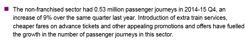Another sector that has registered very strong growth (9%) is the long-distance open access operators like Grand Central & Hull Trains.