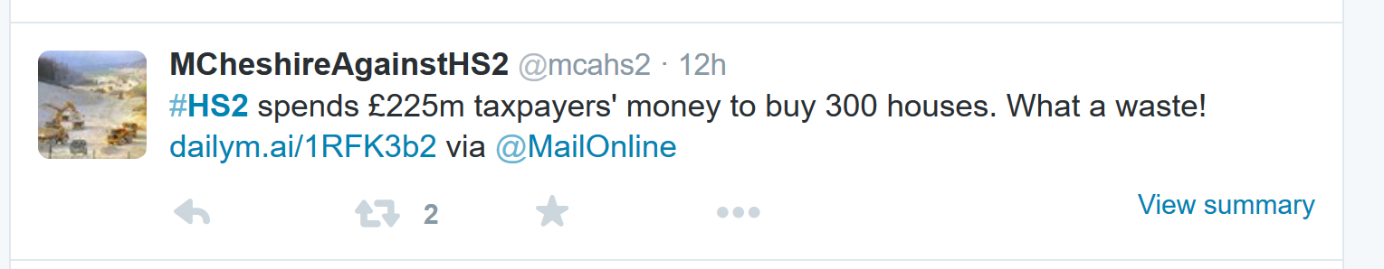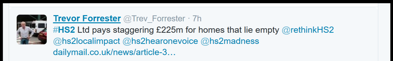 The antis twitter campaign is continuing to implode. Neither of the two remaining ‘national’ groups are doing anything newsworthy so the volume of tweets has decreased. They’re reduced to being a retweeting service or moaning about Hs2 and railways in general. we’re seeing bugger all from the local ‘action’ groups for the same reason – nothing’s going on. What we are seeing more of is the lunatic fringe of the campaign although how a few folk ranting on Twitter is meant to convince anyone in the political arena to cancel hs2 is a mystery.