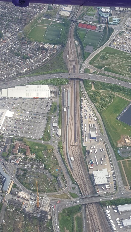 Landed in Dusseldorf after a fascinating flight over London and the port of Rotterdam. You really appreciate its size from the air. Unfortunately I wasn’t able to get any decent pix, but here’s London from above, showing the Eurostar reception sidings at Temple Mills.