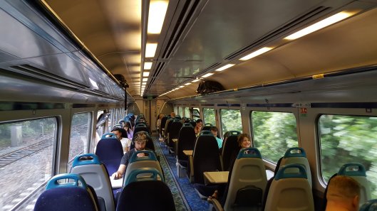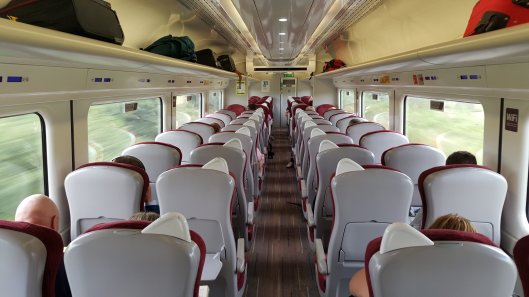 A table bay of four. Note the slots in the top of the seats for paper reservation labels and the fact that (like nearly all modern trains) seats don’t align perfectly with windows. The seats have folding armrests and there’s a power socket (one between two) located just under the front of each pair.