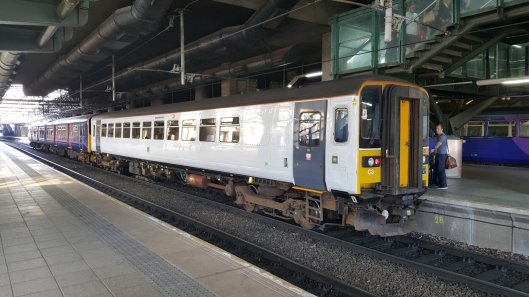 Stopping to change trains at Manchester Victoria I was stuck by how many ex-GWR diesel units were working services. Here’s 153305 (in a neutral white livery) with much-travelled 150129 (ex-Centro, ex-Silverlink, ex-GWR).