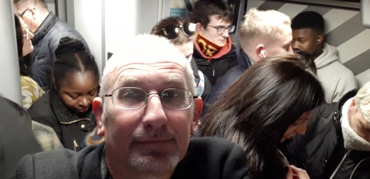We’ve just left Stoke and the crush has eased. There’s still no seats available, but I’ve managed to find a perch in the luggage rack!