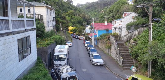 Well, we’ve kept up the slow theme to today! We’re staying in the Aro valley, a lovely little area that nestles in the hills to the South-East of the city. It’s one of the oldest settlements and possesses a quirky mix of wooden homes spread out across the narrow valley sides. There’s a small centre which has a mix of bohemian cafe’s and eccentric shops. The only downside is the cost of property here (a problem across much of New Zealand apparently). Here’s the view from our friend’s house, looking down the valley.