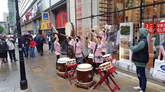 14:40Two very different views of Manchester! First up is Japanese drummers outside a new branch of Uniqlo, which only opened two days ago.