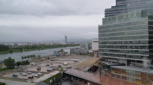 07:13 (all times in German time for now).Another day, another early start. The weather’s pretty dismal in Vienna today but there’s lots to look forward to before I fly back to the UK later. At least I managed some decent sleep – even if there wasn’t enough of it! Here’s the view from my hotel room, looking back to the hill and the location of the vineyard we ate at last night.