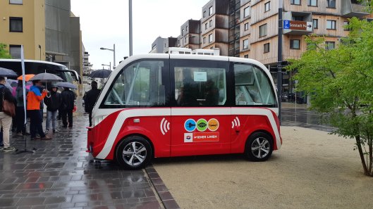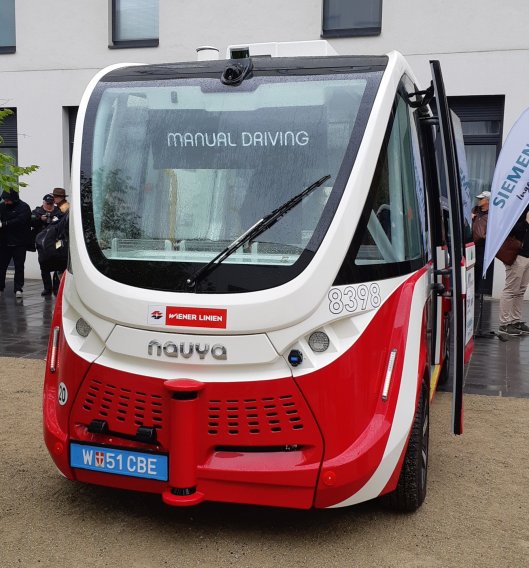 08:35After an excellent breakfast we’ve checked out of our hotel and been loaded into a coach to head off to our first assignment. The chance to see an autonomous bus at the new Viennese suburb of Aspern Seestadt.10:08.Here’s the bus we came to see.