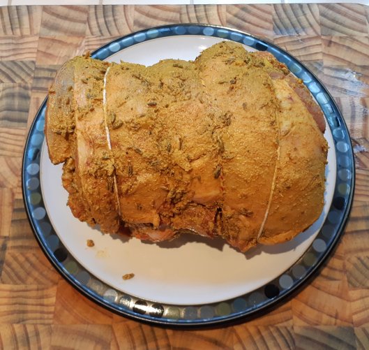 Today a group of friends from the Big 6 pub in Halifax, under the leadership of Tony Allan (of Phoenix Brewery fame) are having a little outing by train, over the Pennines to Rochdale to partake in the Easter ale trail, a new take on the traditional beer festival. It’s another fantastic Spring day here in the Pennines, so the weather’s ideal. Watch out for updates on our (probably unsteady) progress throughout the day! Before we go, Dawn’s been busy in the kitchen as we’re hosting her parents for dinner tomorrow. Last night she prepared a special marinade for this leg of lamb, which will now steep until tomorrow.
