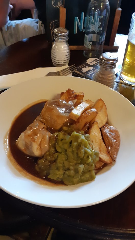 This has been our lunch stop and I couldn’t resist ordering a traditional Lancashire delicacy: rag pudding with mushy peas and chips!