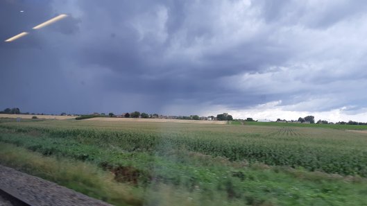 I spent long enough at Ely to change trains, as the rain arrived at the same time I did there was no point in hanging around. Now I’m trying to outrace the weather. The problem is the clouds are coming up from the South, so the sun’s fighting a losing battle. I’m hoping I might get respite at our next stop, Peterborough although looking at the horizon now we’ve passed March I may be fleeing further! Peterborough looks like it’s getting a right soaking!