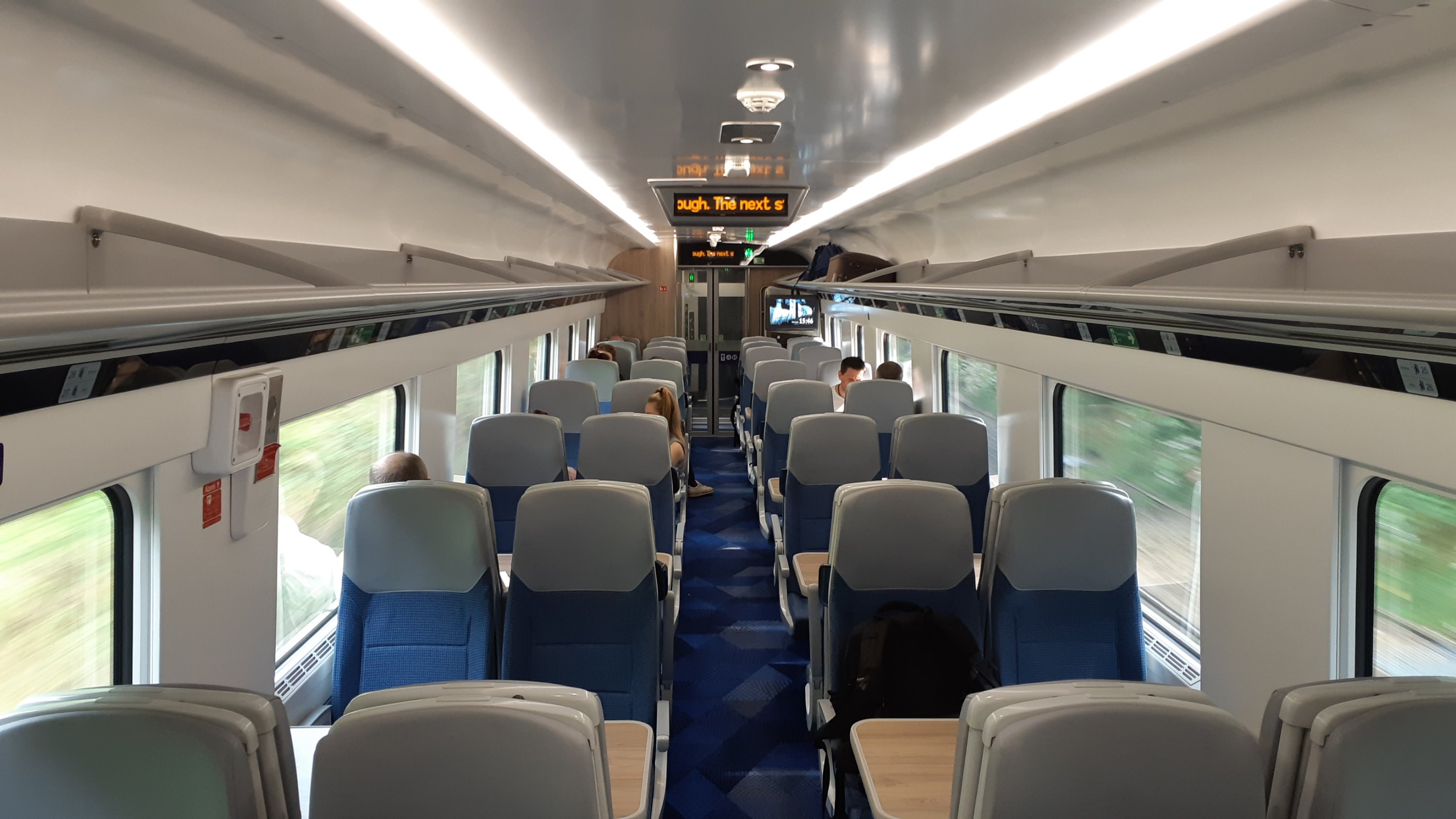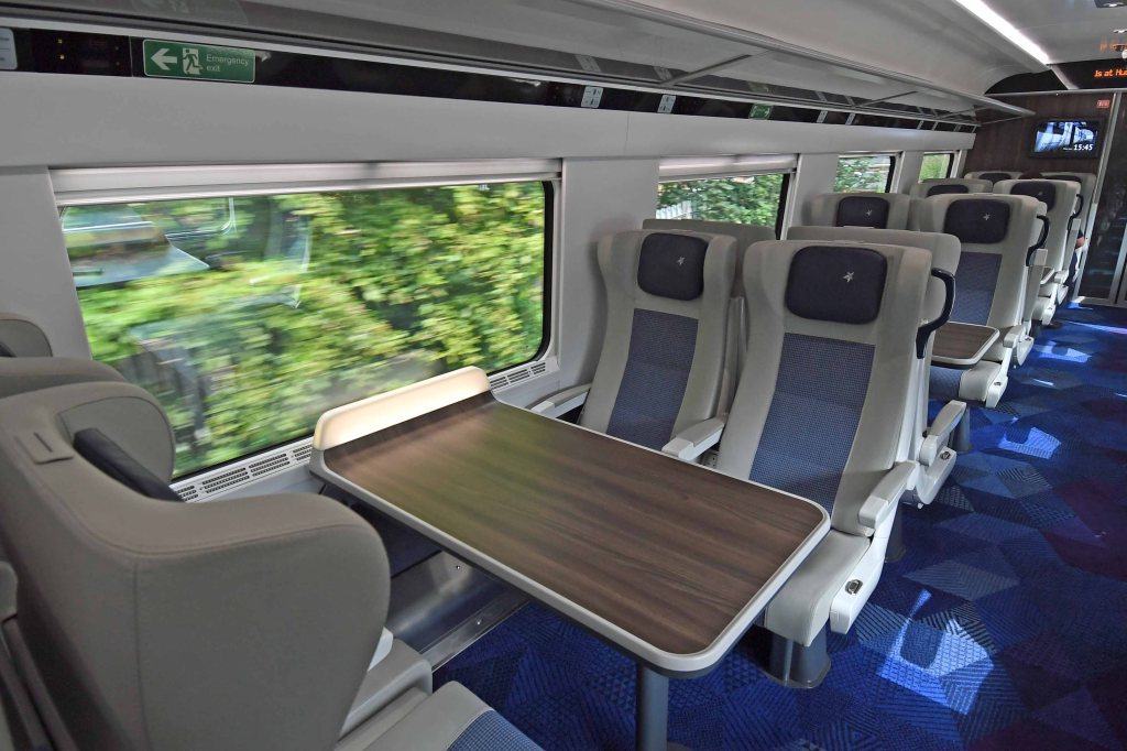 First Class passengers will appreciate the fact they have the coach behind the locomotive to themselves rather than being sandwiched in the middle of a Standard Class coach as on the 185s. This gives them more privacy and the 2 by 1 seating and table bays look very good.
