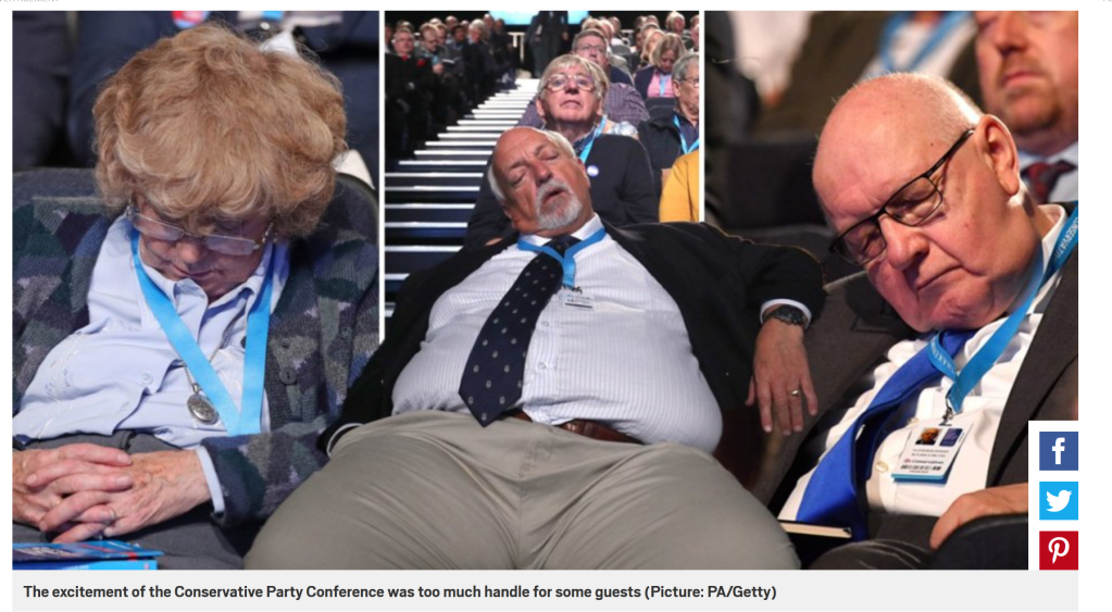 Mind you, it’s not just been the weather that’s stormy. The political scene’s been pretty tempestuous too as Boris Johnson continues to both wreck Britain’s political standing in the world and make the country ungovernable in his hell for leather pursuit of a no-deal Brexit. No lie is to large for the man to tell it and no scenario too preposterous. Parliament’s fought back and now we find ourselves at a political impasse and the party conference season. The bits that I’ve seen of the Tory conference make it look like a cross between the Benny Hill show and a zombie movie, as this little gem shows. Add some batshit crazy speeches from a few clueless Cabinet Ministers and you can’t help but wonder what our European neighbours make of this mess when they see the scandals around Johnson unfold and hear the bonkerssruff coming out of the mouths of his Cabinet. It’s no wonder so many delegates are choosing to take a nap…