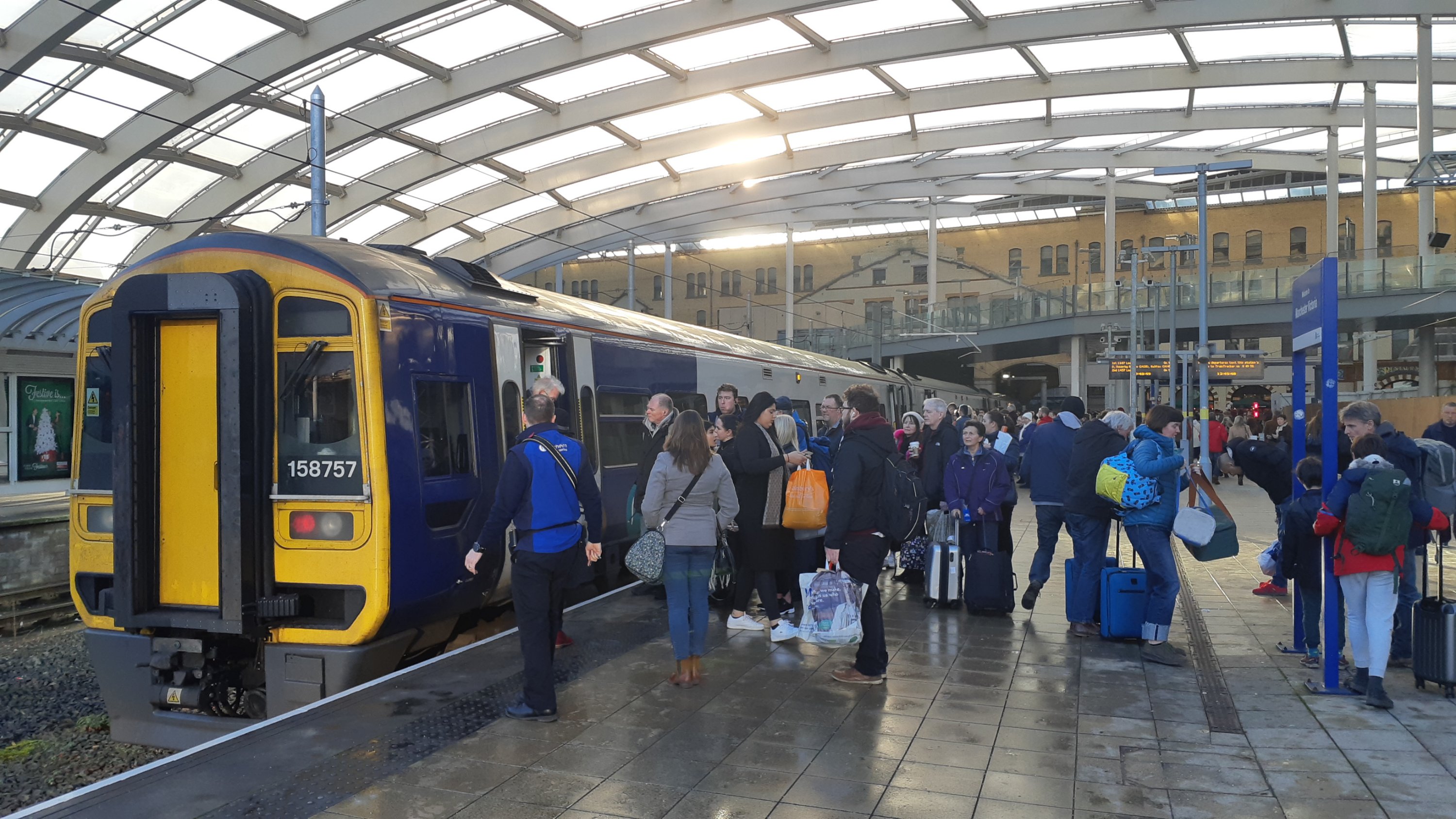 We’re on our way on a packed 3-car from Sowerby Bridge, with 7 of us sharing a vestibule. At least there’s tip-up seats in the vestibules of these old 158s so it’s not too bad! Mind you, we’ll be calling at several stations on the way, so this train could be quite ‘cosy’ by Manchester…