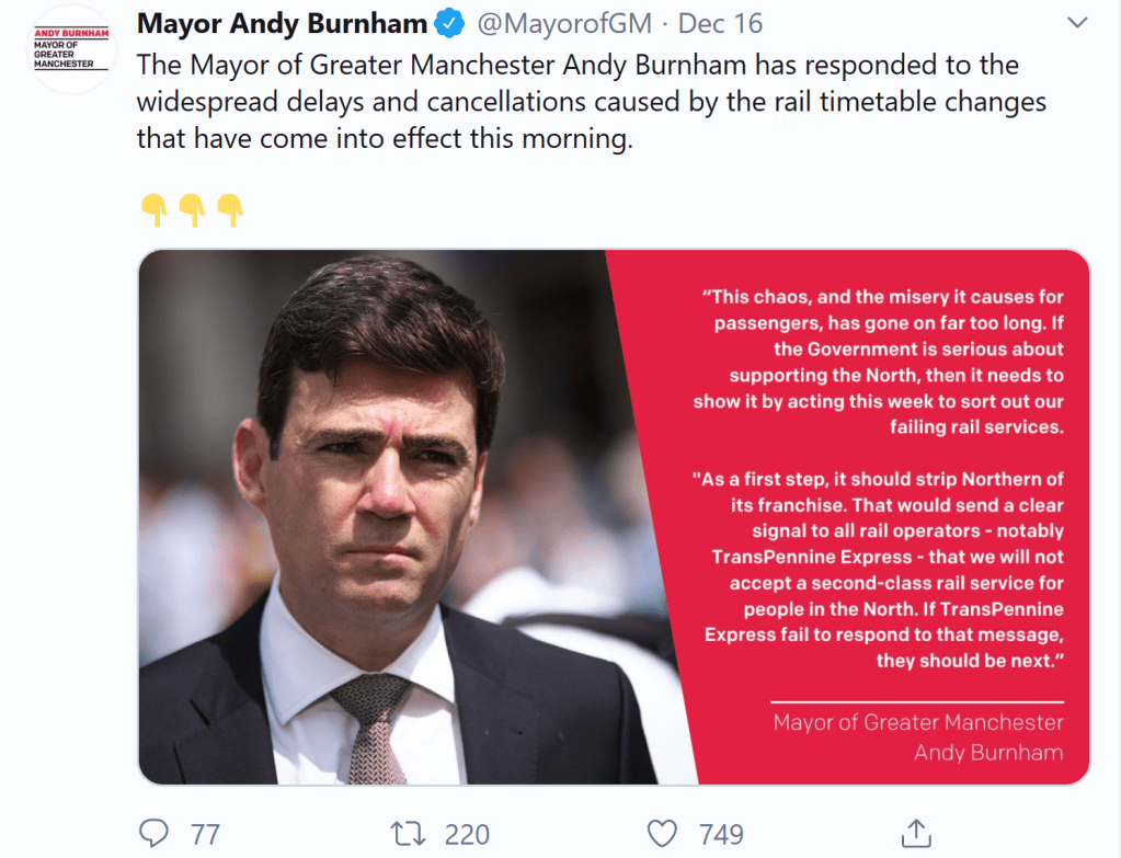 I’ve remarked before that TPE always seemed to get off lightly when it came to complaints about rail services. It was always Northern Rail getting it in the neck, but this looks to have changed as I saw this tweet from Manchester Mayor Andy Burnham earlier. Of course, he stuck the boot into Northern first!