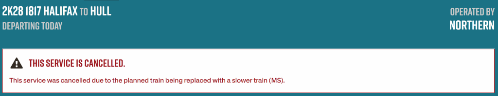 This evening I’ve been watching live train schedules on RTT and feeling sorry for the poor buggers trying to get home from places like Huddersfield, where the Trans-Pennine service appears to have gone into free-fall with many trains cancelled and the ones working in from Leeds or Manchester already rammed by the time they arrive.