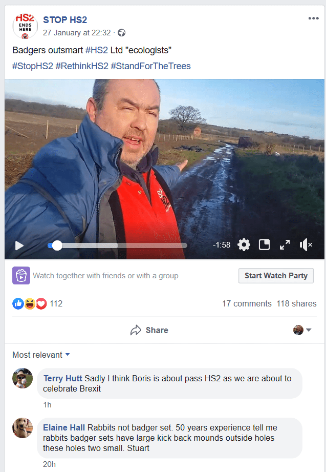 But what of the StopHs2 campaign? It goes from farce to worse. Poor Joe Rukin has made a fool of himself yet again in this overwrought post on the Stop Hs2 Facebook page. A wildlife expert he clearly isn’t. Look at the reply to his Badger sett claim!