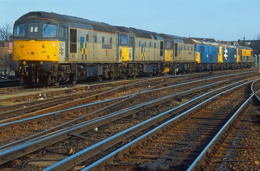 Here’s another sample that also shows just how much the railways have changed since 1991. This is Gillingham (Kent) on a quiet Sunday when spare locos used to be stabled just outside the station. All these are ex-Southern classes which have now (mostly) disappeared, although the later versions of the Class 73 electo-diesels still put in sterling work on the Southern for freight company GBRf.