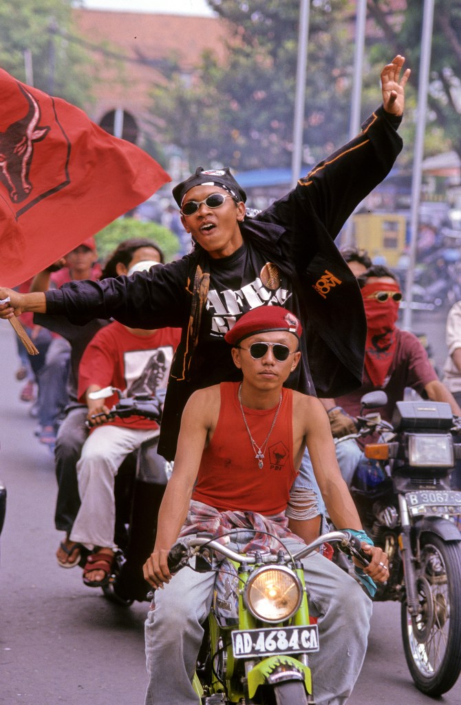 President Suharto had (finally) stood down earlier in the year. Students like this had been in the forefront of the campaign to oust him, with many losing their lives. This group were supporters of Megawati Sukarnoputri, the daughter of the first president of Indonesia, Sukarno, who Suharto has ousted in a political coup in 1967. They used to demonstrate through the centre of Yogyakarta most days and that’s when I got this shot.