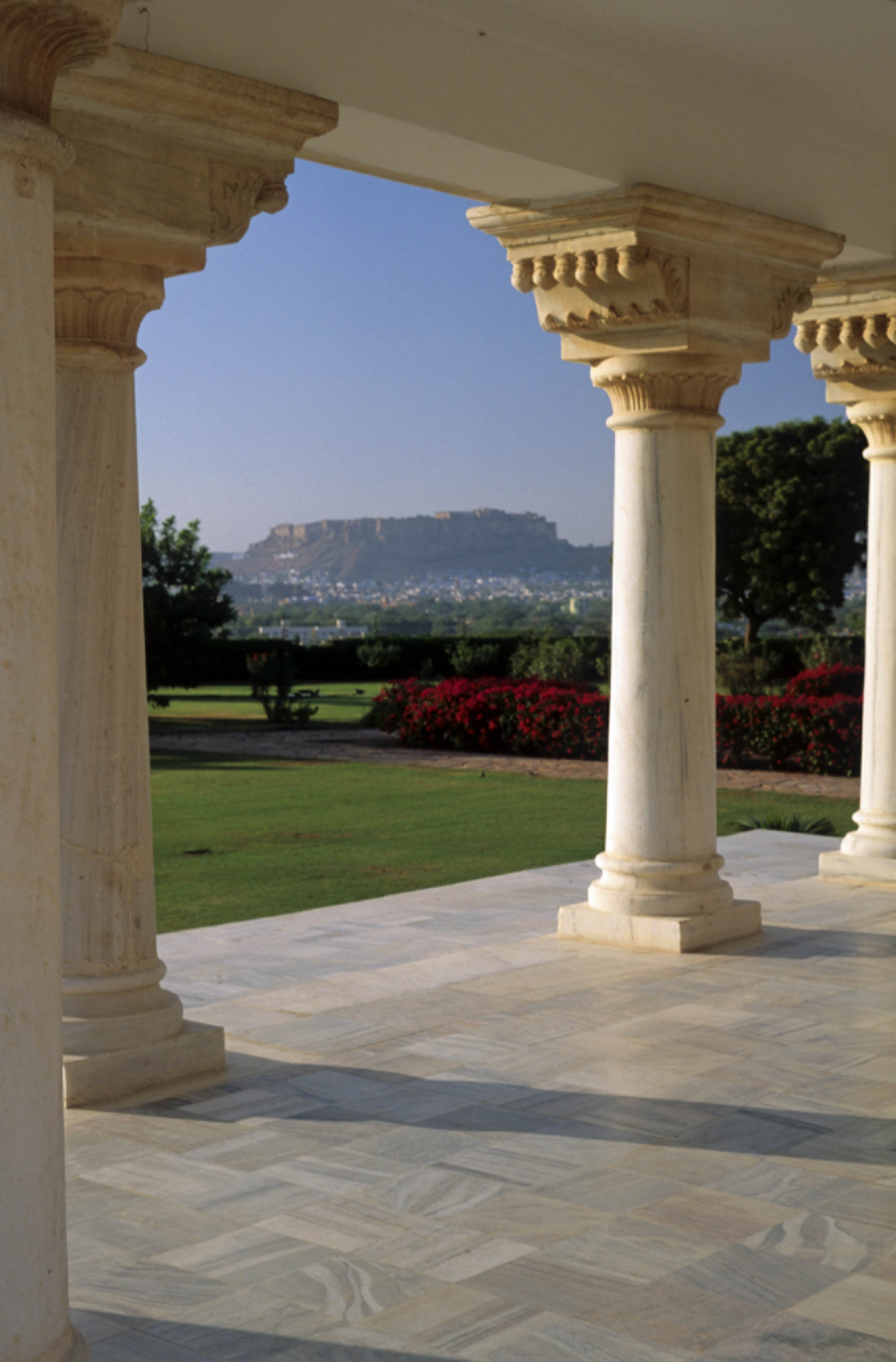 I took this picture in October 1993 at the Umaid Bhawan palace in Jodhpur, Rajasthan, India. Lynn and I were staying here for a night after a 5-day camel trekking safari in the Thar desert. On the horizon you can see the clifftop walls of Jodhpur fort which dominates the city below. What magical places these were!
