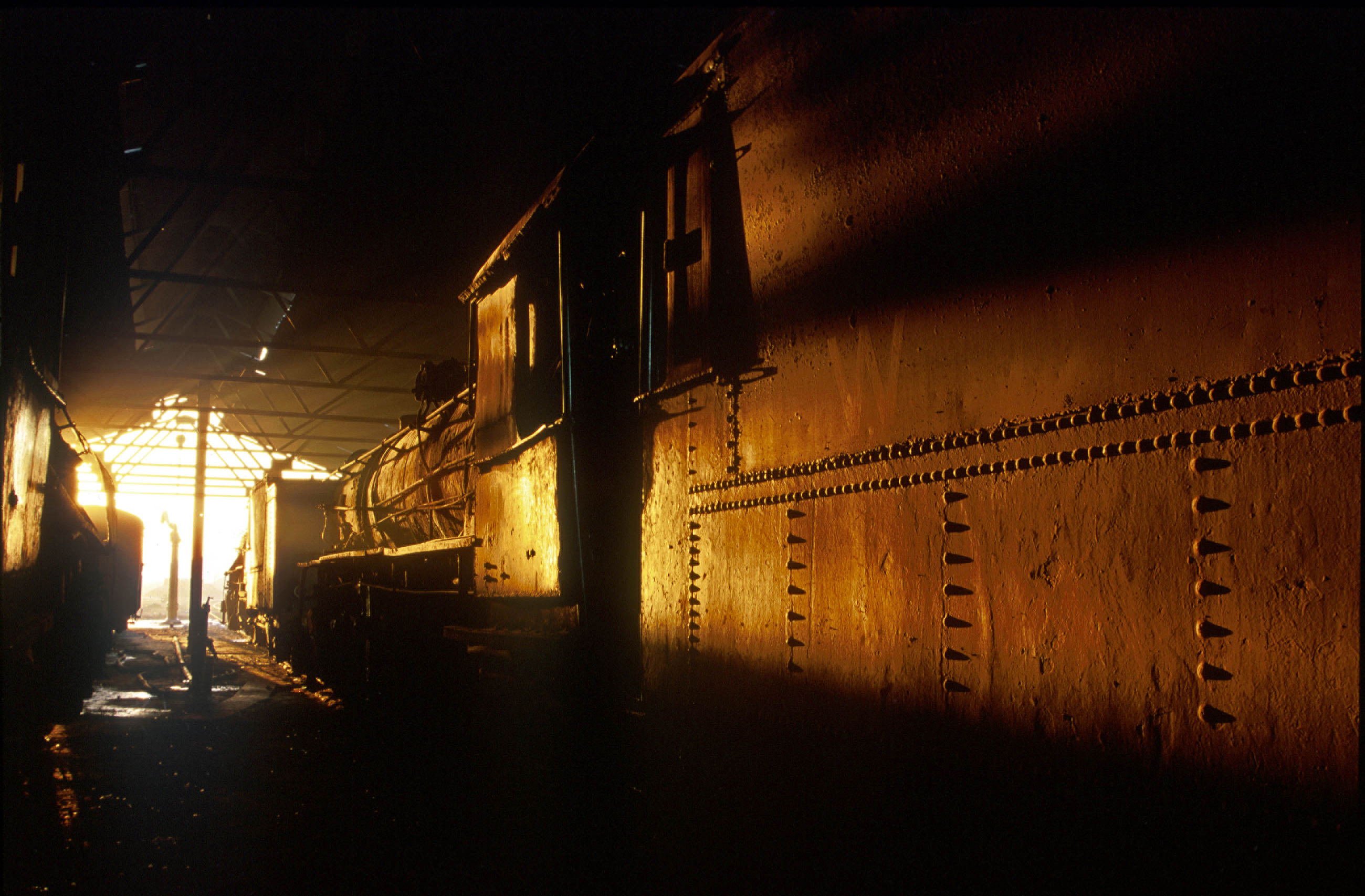Right, on that happy news it’s time for a picture of the day. Today’s choice is something different. Back in 2000-2001 I was travelling in India. Lynn and I had visited friends in Goa for Xmas and New Year, after which Lynn flew back to the UK and I stayed on to visit the Gujarat in Northen India to get travel pictures. I also hoped to find the last Indian steam locomotives operating on the national network. Broad Gauge steam had already disappeared, but there was a last outpost of metre gauge steam operating out of the evocatively named Wankaner Junction! I arrived there at the beginning of February 2000 but I was weeks late. The last locomotives has run at the end of January. However, Wankaner locomotive depot was still littered with engines. Their fires had been dropped and the place left deserted with the last locomotives and the remains of others that had been cannibalised over the years to keep them running. Here’s a picture I took inside the shed early on the morning of February 13th 2000.