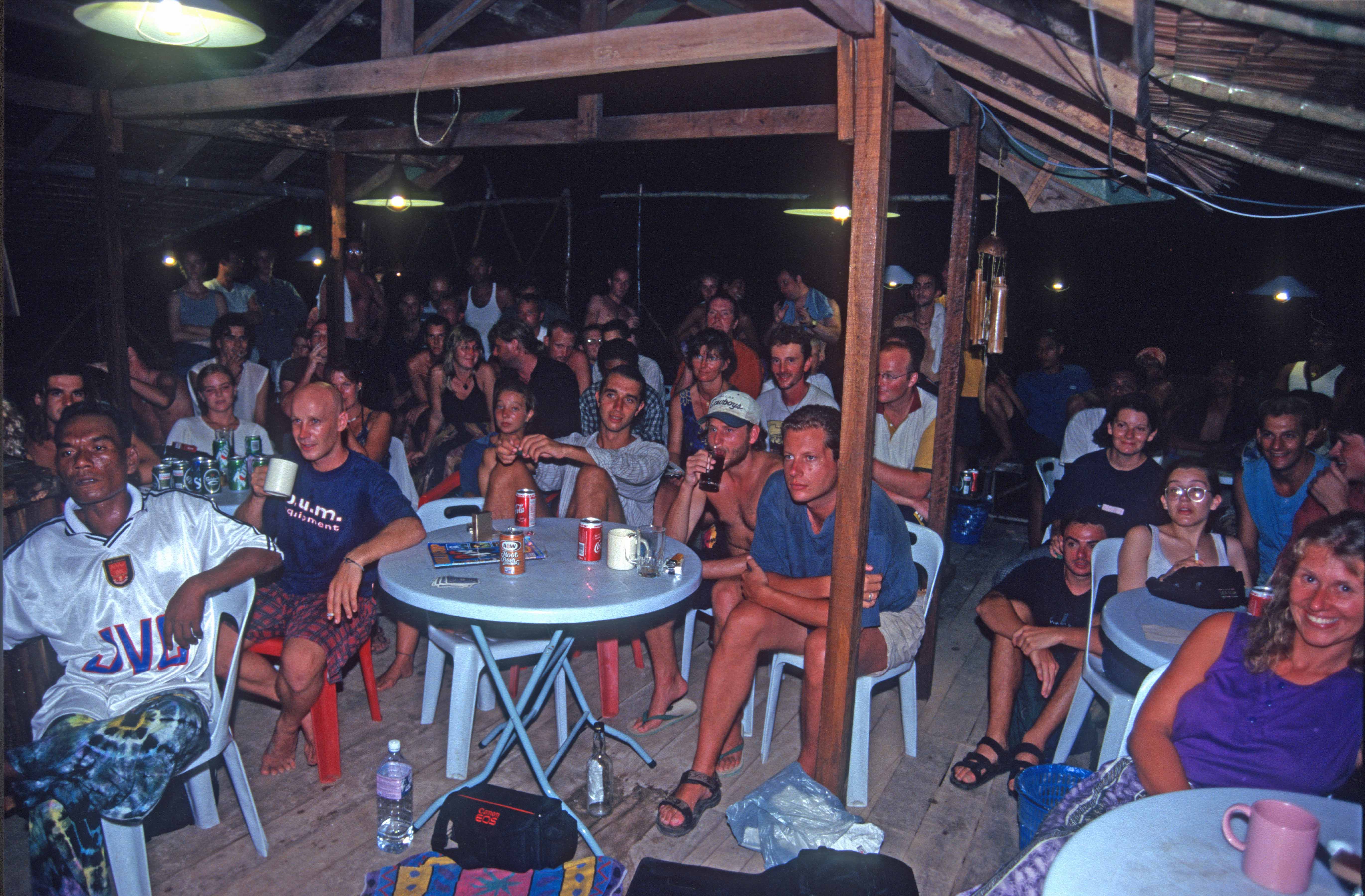 I took this on the 10th June 1998 in the Perhentian Islands, Malaysia. This is people of all nationalities (including a solitary Scot!) gathered around a TV in a restaurant to watch the opening match of the 1998 World Cup which was between Scotland and Brazil. Neither Lynn nor I were great football fans, but what struck me about this night was how international it was. There were people from dozens of countries who’d pitched up in the Perhentians who just wanted to watch the footy! There’s another twist too. These two islands are mostly ‘dry’. Alcohol’s hard to come by (or expensive when you can get it) so it was probably one of the most sober group of football supporters I’ve ever seen – hence the absence of beer bottles on the tables. Even so, looking back at this picture I remember it as a cracking night in a place I’ll always remember.