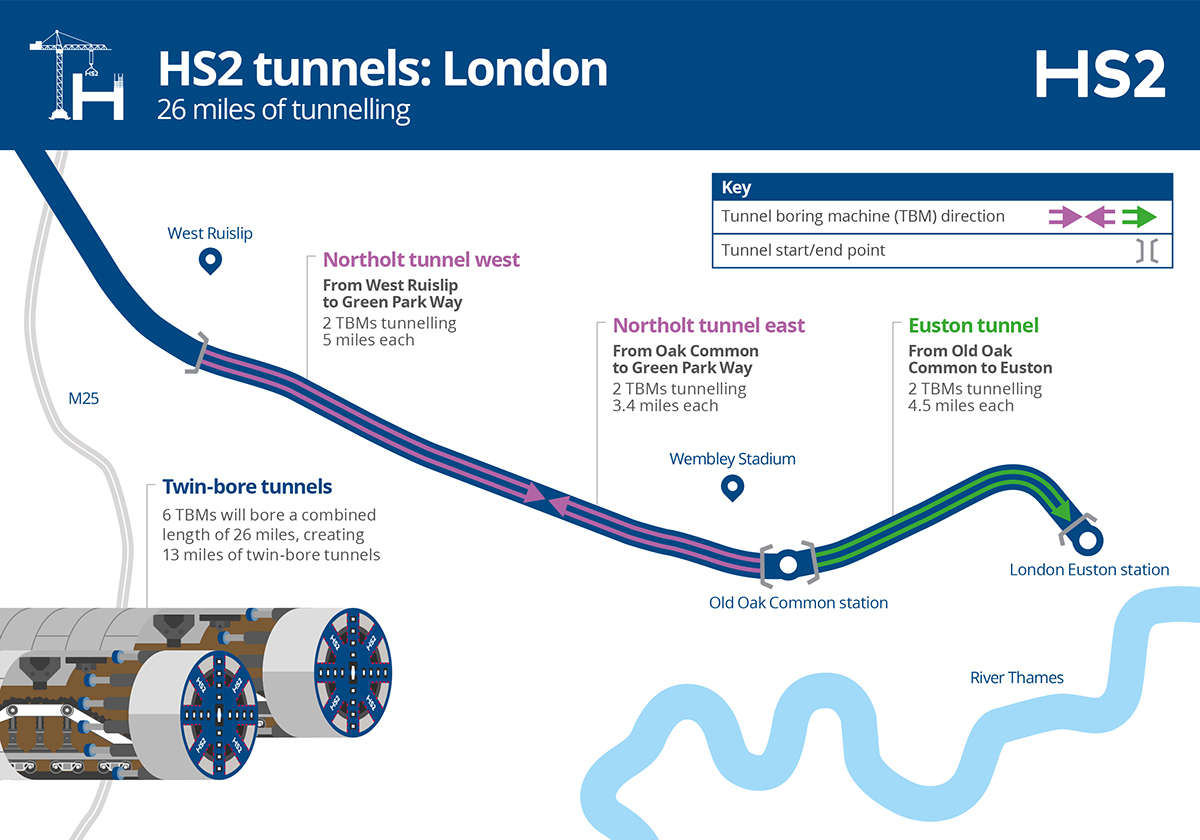 These first two London TBMs will be launched from a portal at West Ruislip and will travel 5 miles east, creating the western section of the  Northolt Tunnel. Once they arrive at Green Park Way in Greenford the machines will be extracted from the ground and the site will then be used as a vent shaft. The 8.4 mile tunnel will be completed with a 3.4 mile tunnel drive from Old Oak Common using two further TBMs which are yet to be procured. A second tunnel between Euston and Old Oak Common will complete the remaining 4.5 miles of London tunnel between the two HS2 stations.