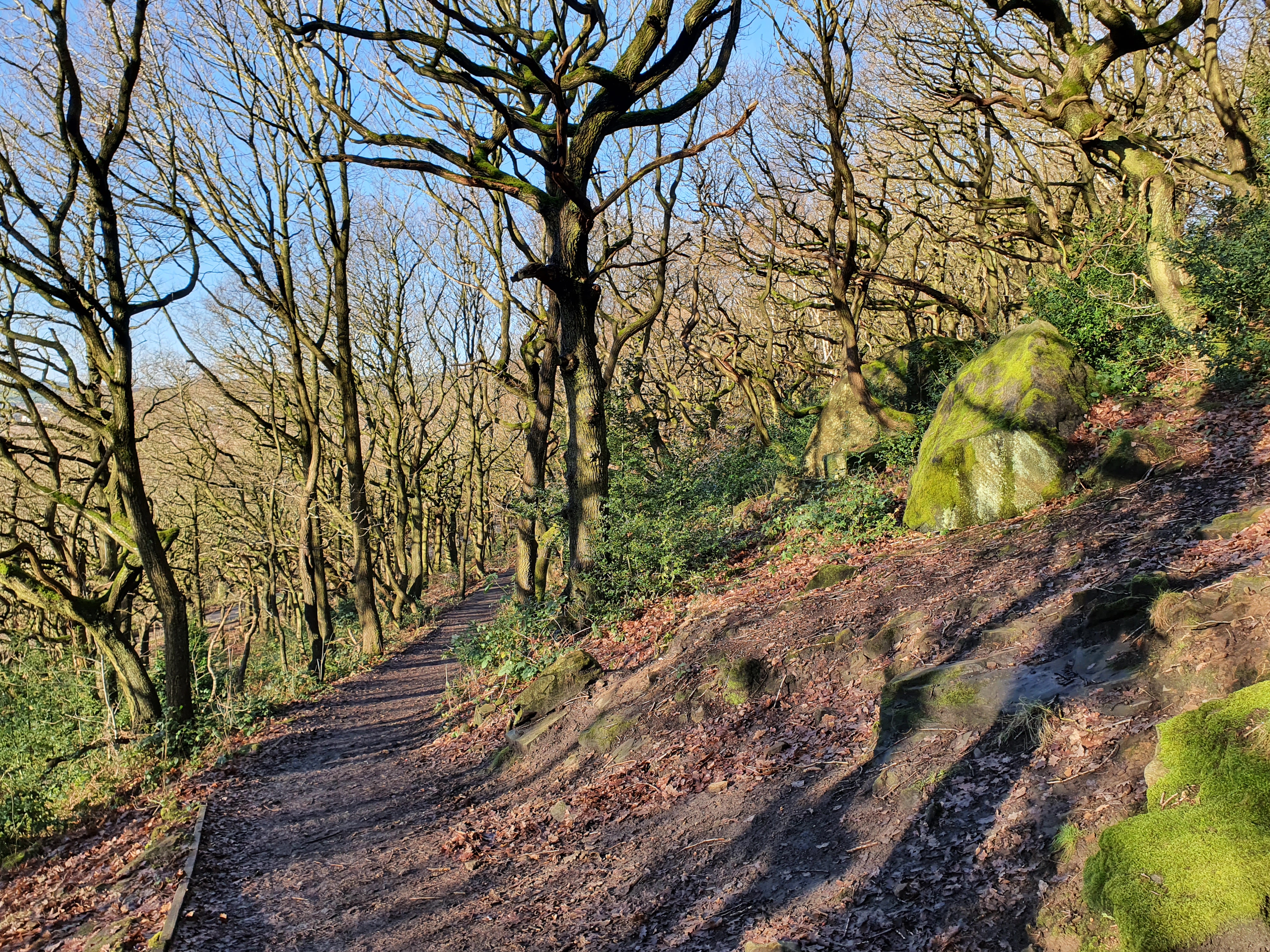 My stroll was pretty strenuous as these woods aren’t exactly flat, which is part of the attraction as it’s a much more interesting landscape. On leaving the woods my perambulations took me up to the promenade on the edge of Halifax which permits some stunning views across the Calder Valley. Wandering on I dropped down one of our local cobbled hills which has been made famous in one of the opening scenes of the TV drama ‘Gentlemen Jack’. Half way down there’s a great place to stop as you get two very different views. This one across the valley…