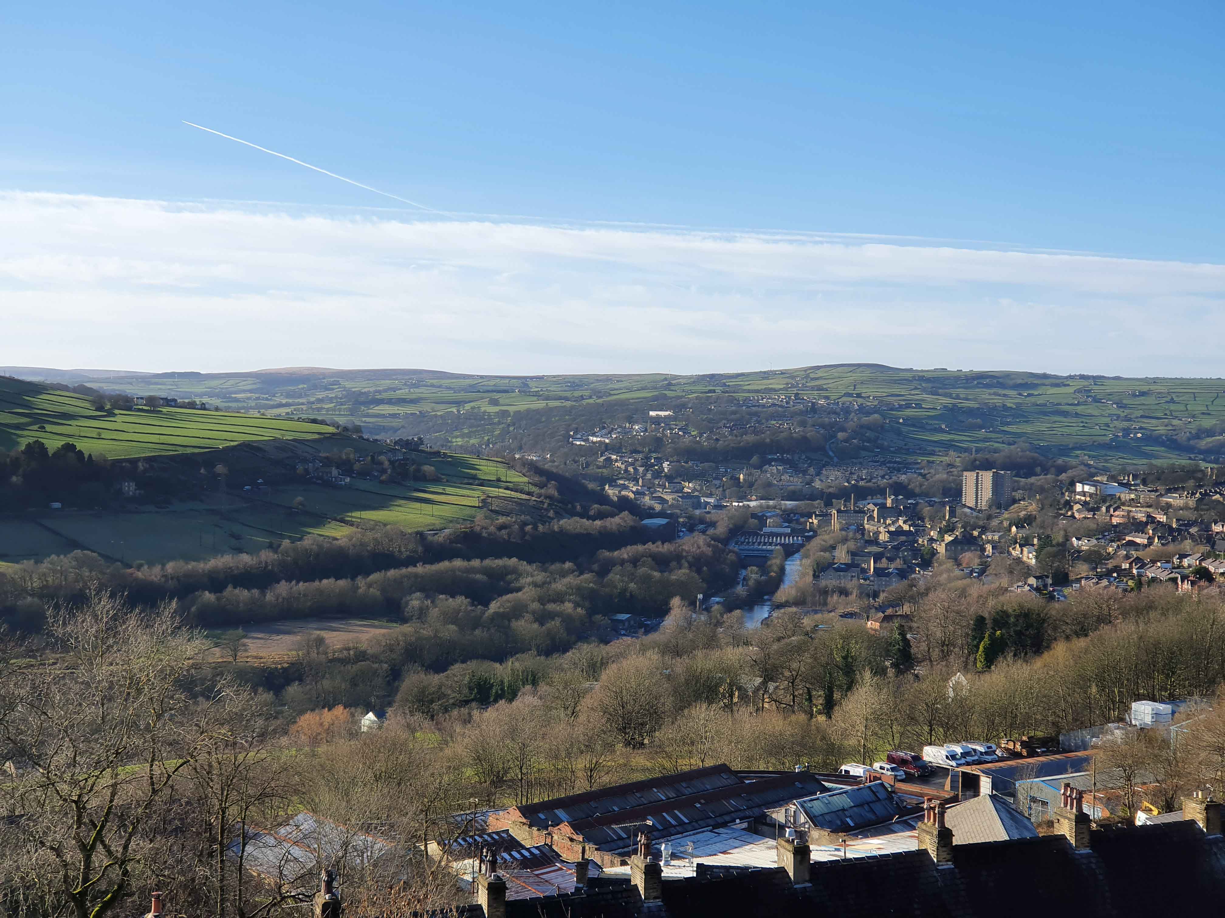 Looking down on Sowerby Bridge, plus a rare sight in the sky nowadays – a plane’s vapour trail!