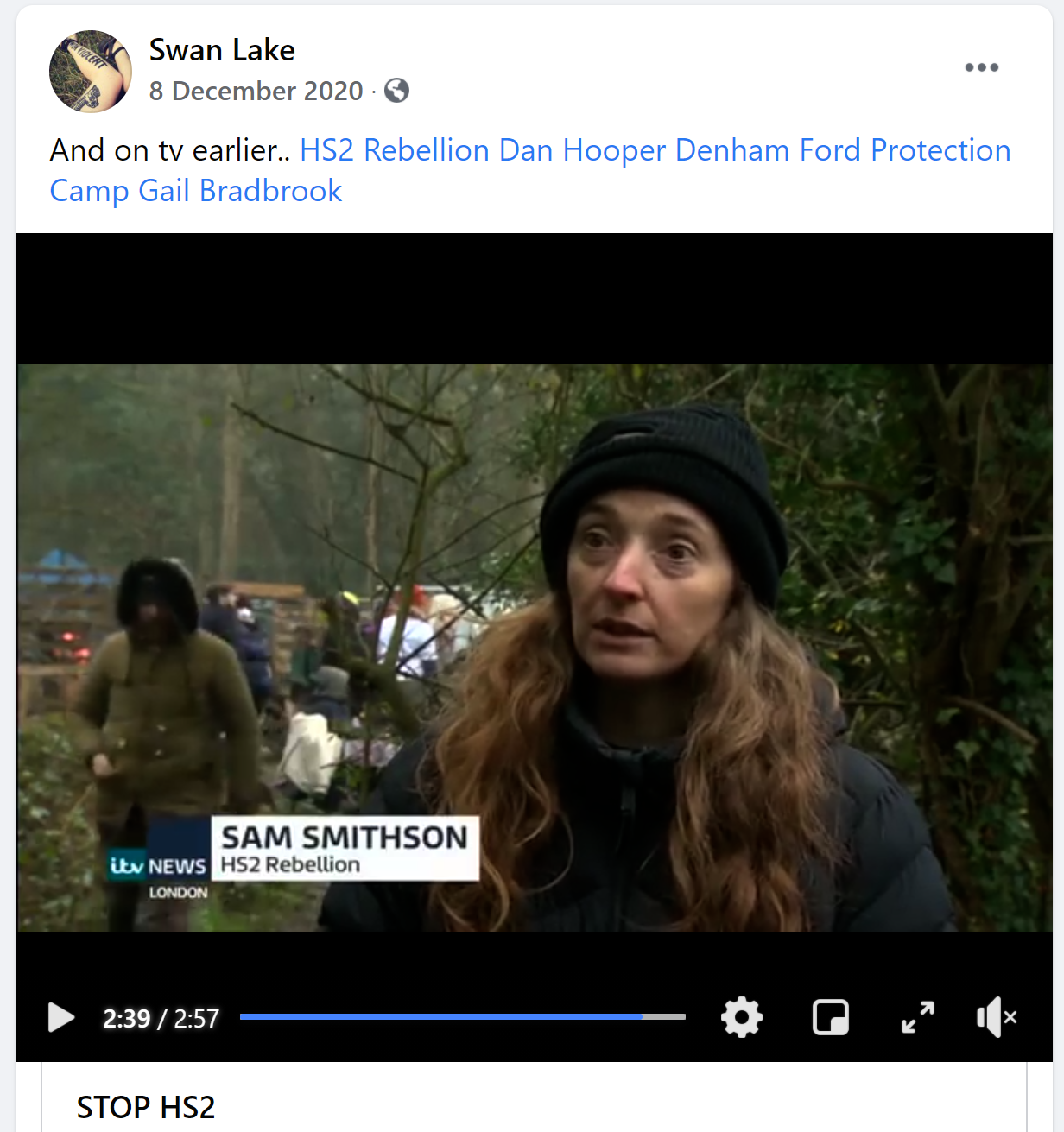 Meet Sam Smithson, AKA “Swan”, a protester who lives at the risibly named Denham Ford ‘protection’ camp North of Uxbridge, where the protesters have failed to stop the National Grid moving some High Voltage pylons that are in the way of HS2. Back in the summer ‘Swan’ had a fall from some ropes whilst protesting and the anti HS2 websites were full of claims that she’d broken her collarbone. She made a miraculous recovery and was photographed bouncing on a bed in the hotel she was taken to immediately after her arrest!