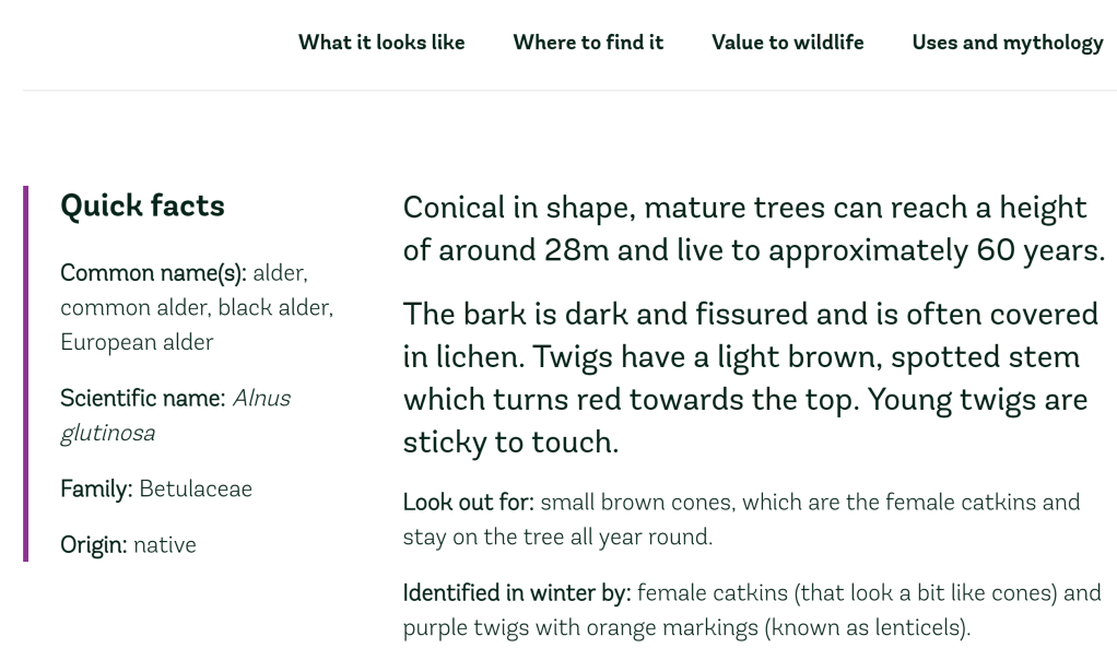 So, what’s the truth here? As usual, just a few minutes searching on Google and Caroline’s claims are in tatters. Here’s what the Woodland Trust REALLY say about the Black Alder. Yep, you’ve guessed it – the ‘black’ Alder is just another name for the Alder tree – and it’s also called the Common Alder – because it’s not rare at all! Nor is it a particularly long-lived species, which is why I was giggling last year at the claims about ‘ancient’ Alders!