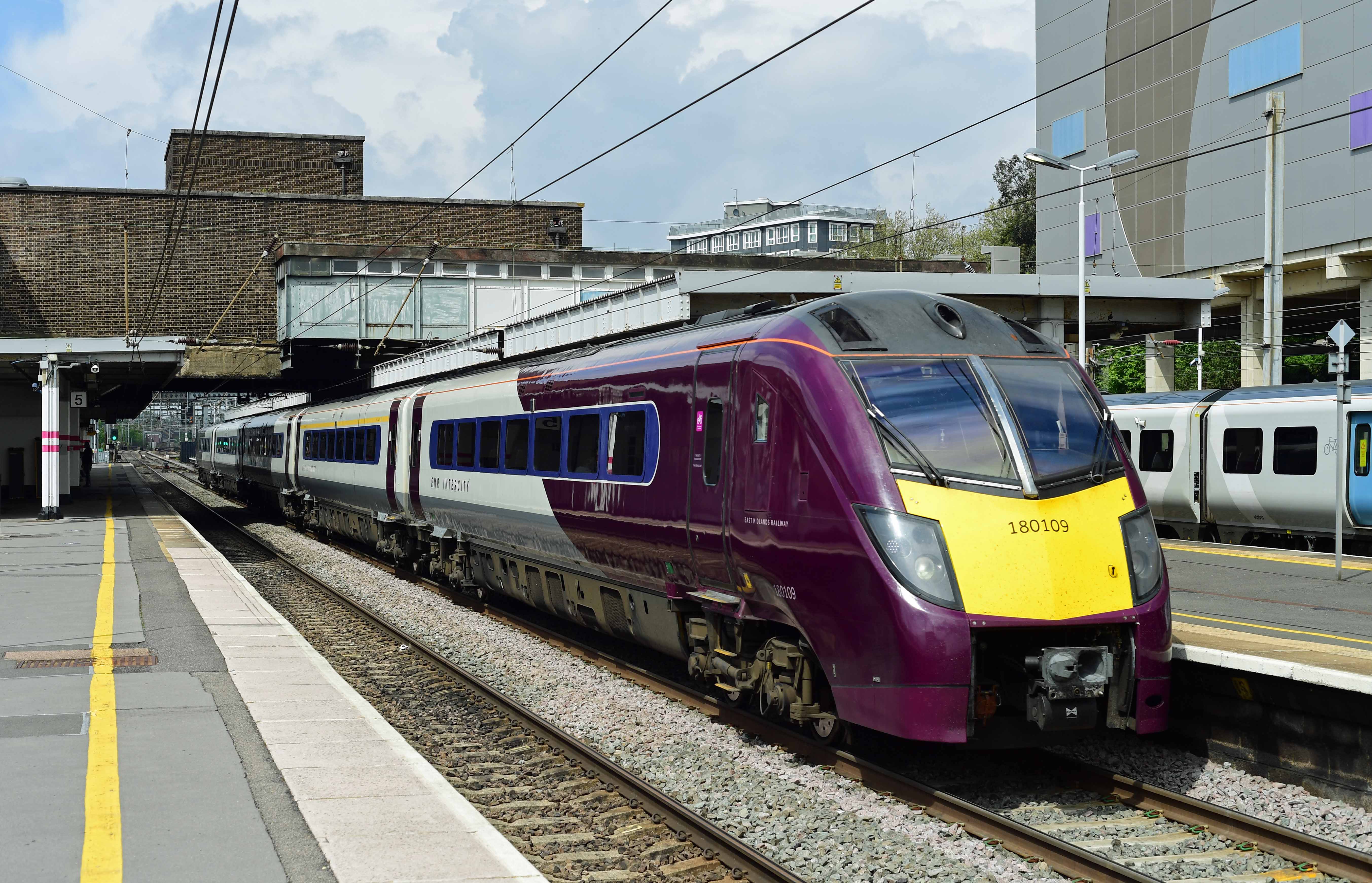 The Midland Main Line’s starting to look very different from the route it has been for decades. Electrification North of Bedford, reinstating four-tracking, re-aligned and rebuilt stations, there’s been quite a shopping list. Then there’s a ‘double-take’ on the train fleets. The old High-Speed Trains (HSTs) were retired last week. In their place has appeared two ‘cast-off’ fleets. The electric Class 360s from Anglia and the diesel Class 180s which have moved between First Great Western, Hull Trains and have now pitched up with EMR. Here’s 180109 powering through Luton with a service from Nottingham to London St Pancras.