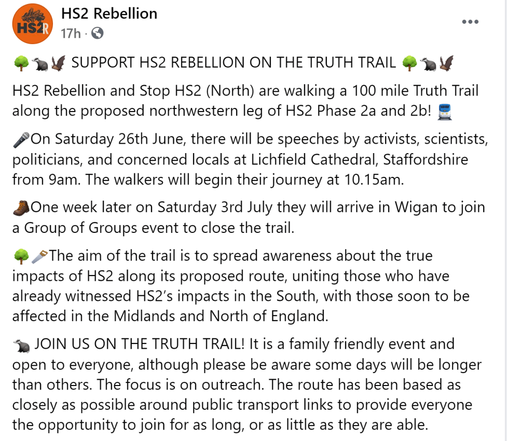 Hs2Rebellion’s latest wheeze now that they’ve failed to stop Hs2 being built in the South is to roll out the same old failed tactics in the North. In this instance by trying to get people to join them on the laughably-named ‘Truth Trail’, otherwise known as a 100 mile group walk.