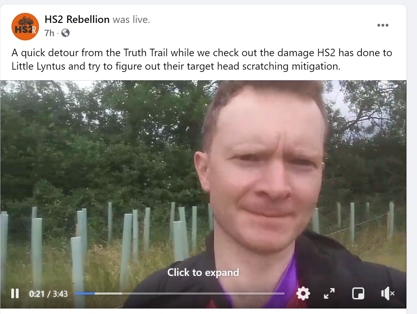 Still, I’m sure the HS2Rebellion Facebook page is full of banner-waving people joyously marching North from Lichfield, isn’t it? Err, no. All it contains is a couple of video’s from a trio of people who say they’ve ‘detoured’ from the main march (which we never see) to drive (wait a minute, drive?) to a couple of woods on the route they claim will be ‘destroyed’ by HS2.