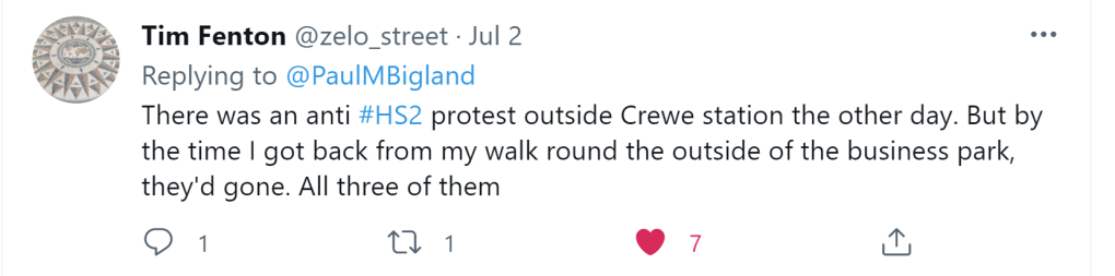 So this ‘travesty of the truth trail’ was always doomed to failure. Even the media ignored it apart from a couple of local news websites. After all, where’s the news? “A few southern Nimbys, anarchists and hippies march to the North to tell it what’s good for it” is hardly a good story, is it? The well-known Crewe based political blogger Tim Fenton (aka @zelo_street) had this to say on Twitter.
