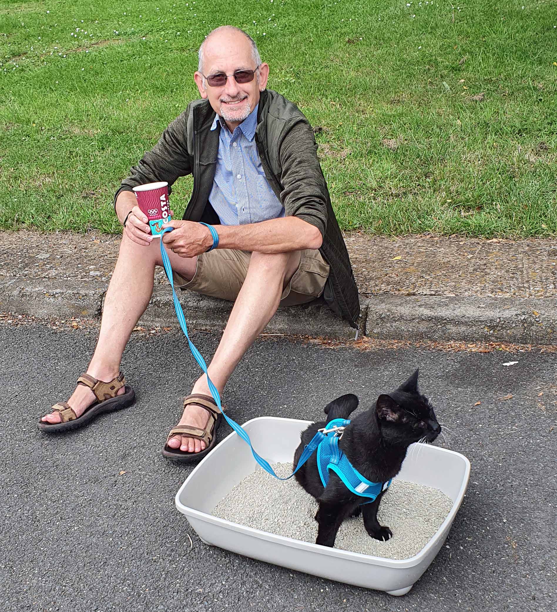 The four of us, plus Jet, our ageing moggie drove down here on Friday. Yep, the cat’s with us. When we go away for more than a couple of days we normally leave the old boy with Dawn’s folks. The fact they were coming with us left it a no-brainer – Jet could come too! Having a cantankerous cat with you on a long road trip could be problematic – especially a cat that’s never left Yorkshire in his (nearly) 20 years of life. But in reality he was a star – talk about ‘cool for cats’! He’s always been an inquisitive soul so he spent the much of the trip looking out over the top of his cat-basket, watching the world go by. He’s too old to start leaping around nowadays so we knew we could trust him. That said, Dee did buy a little harness and lead for him – which is the first time he’s ever worn such a contraption. There was no fussing and fighting, just a resigned look on his face as if he was saying ‘do I have to’? The harness was more so that if we had to hoik him out of the way of less relaxed animals (well, dogs really) when we stopped for a break on the motorway, we could do it with ease and didn’t have to worry about him doing a runner. We needn’t have worried. Other pet owners at Watford Gap were quite amused and also very good when they saw a cat on a lead and Jet took it all in his stride – not bad for an old boy!