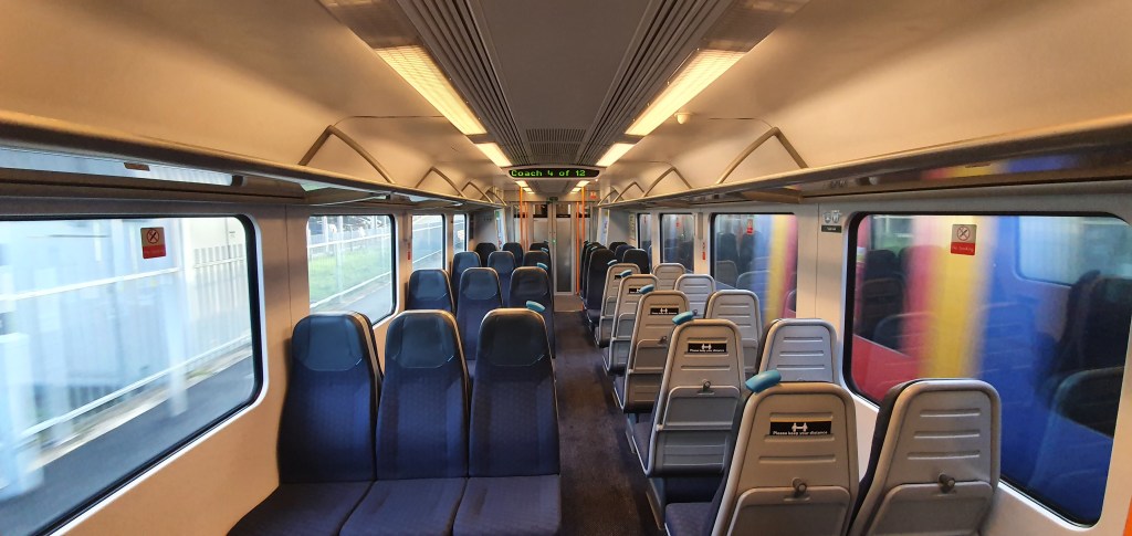 I’m currently sat on the London train, a 12 car set from Alton to Waterloo which is pretty empty. In this neck of the woods a lot of people are still working from home. Oh, there were a few dozen people waiting for the train to arrive and it is early, but you’d expect far more than this on a normal working day. It’s upper and middle-class commuter zones like this in the South-East where the rail recovery is going to be the slowest. I’ll be interested to see what Waterloo looks like when I arrive in under an hour. Still, my train’s clean and well-presented. The interior of this Siemens Class 450 has been refreshed with the new SWRailway seat mocquette and there’s now power sockets throughout . Oh, and wifi – which is how I’m transmitting this blog.
