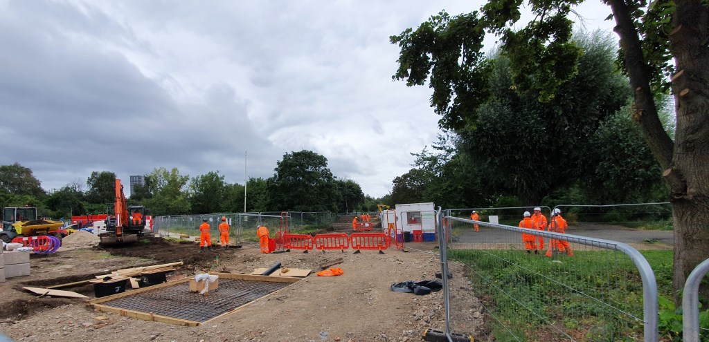 I’ve had a busy time. My next stop was to East Acton, where I wandered up to Wormwood Scrubs to see the work HS2 contractors are doing to divert some utilities. As usual, some local ‘greens’ are screaming blue murder about the “destruction” of the Scrubs. There’s even a squalid squatters, sorry “protest” camp on the site near the work that’s taking place. Needless to say, the reality of what’s happening is far more mundane. A trench is being dug from OldOak Common Lane N-E along the edge of the Common. The fencing is far wider than the trench itself! Here’s the compound on the main road. Not exactly ‘laying waste’, is it? I’ll do a different blog about the whole site another time.