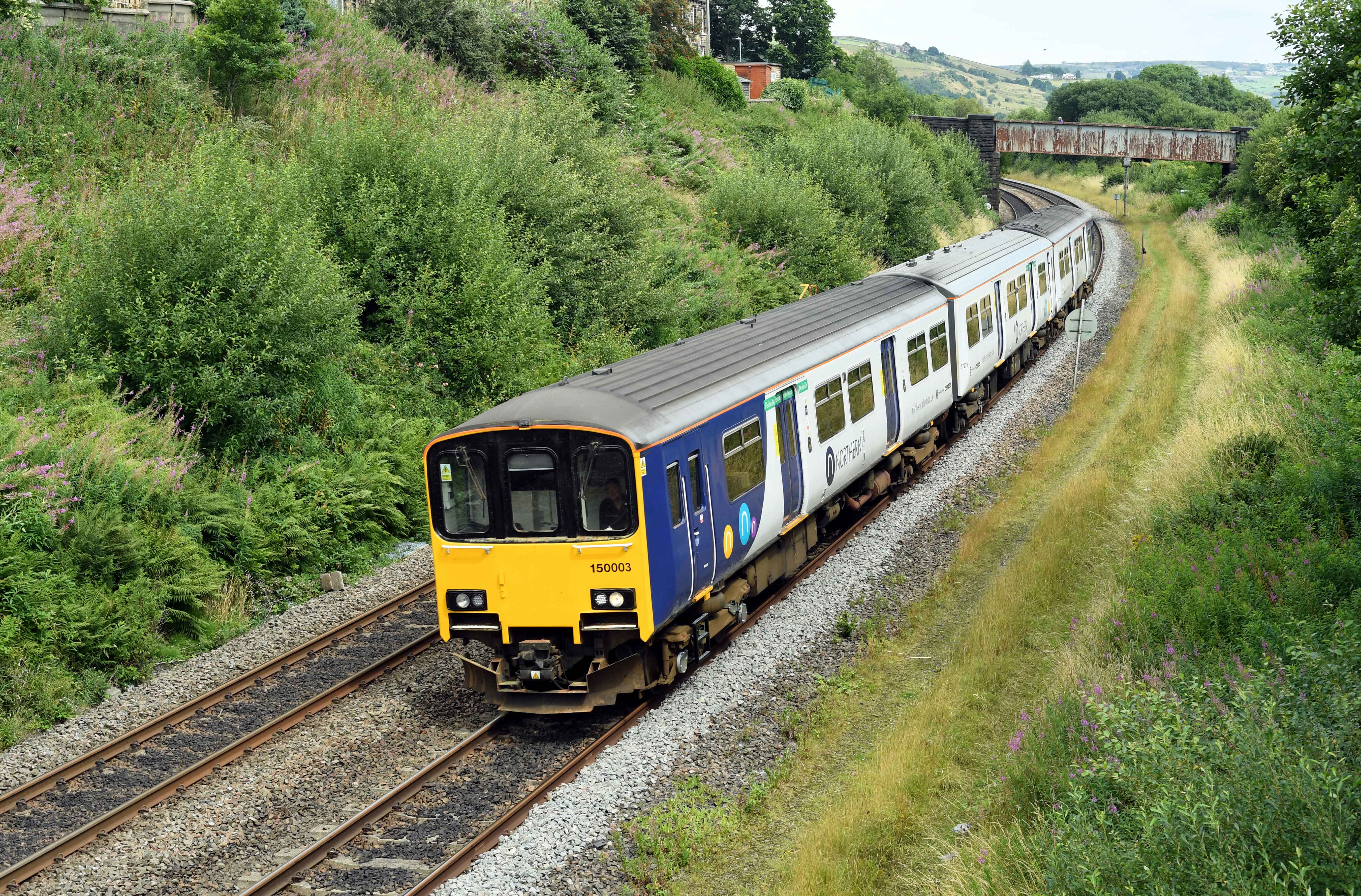 First up is a shot from Marsden featuring an empty stock move from Newcastle’s Heaton depot to Manchester’s Newton Heath shed. Renumbered 150003 this is Northern’s newly converted 2-car Class 150116 which has been modified to run as a 3-car by the insertion of a 150/2 vehicle (57209). Three more of these units are to be converted, bringing the total to 6. This isn’t a new idea. Several trains ran in this formation when they worked for Central trains in the Birmingham area back in the 2000s.