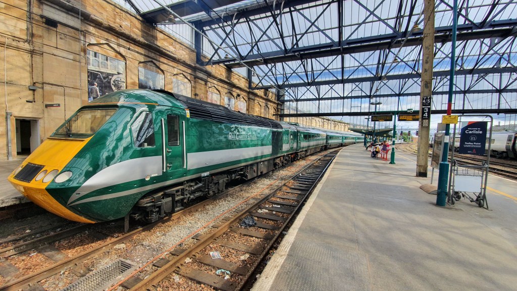 I’m now on the final leg to Carlisle after changing trains at Preston and Lancaster. All the services I’ve used today have been busy. It’s true that Preston station was quieter than I’d usually expect this time of year, but then there’s rather a dearth of foreign tourists – for obvious reasons! From Preston I caught a TPE Class 397 working a Manchester Airport – Edinburgh service, which was well loaded. If it had been on one of the old 3-car Class 185s used on the route it would have been rammed. I’ve not travelled on a 397 on the WCML before so I was pleasantly surprised at the quality of the ride at linespeed – especially as I was stood over a bogie on the trailing vehicle!