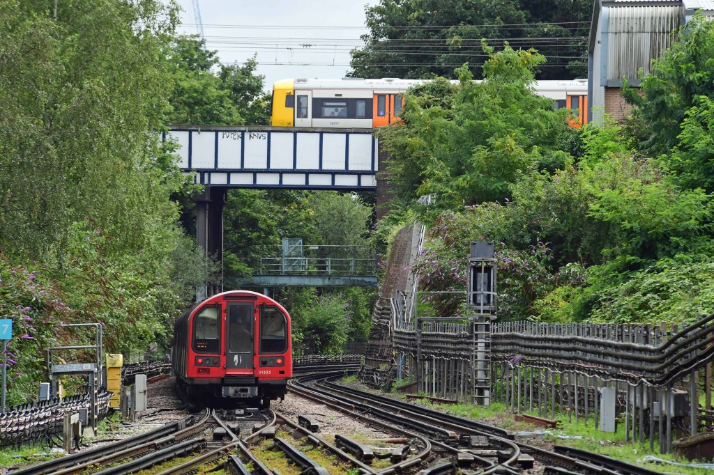 London’s rail network is fascinating. Lines crisscross the capital – and each other. Here’s one such place where two very different systems cross in the open. I took this shot at North Acton on Tuesday whilst I was out looking at various HS2 construction sites. The timing was just right and as a Central line tube train pulled out of the station and headed towards the city a London Overground Train passed overhead.