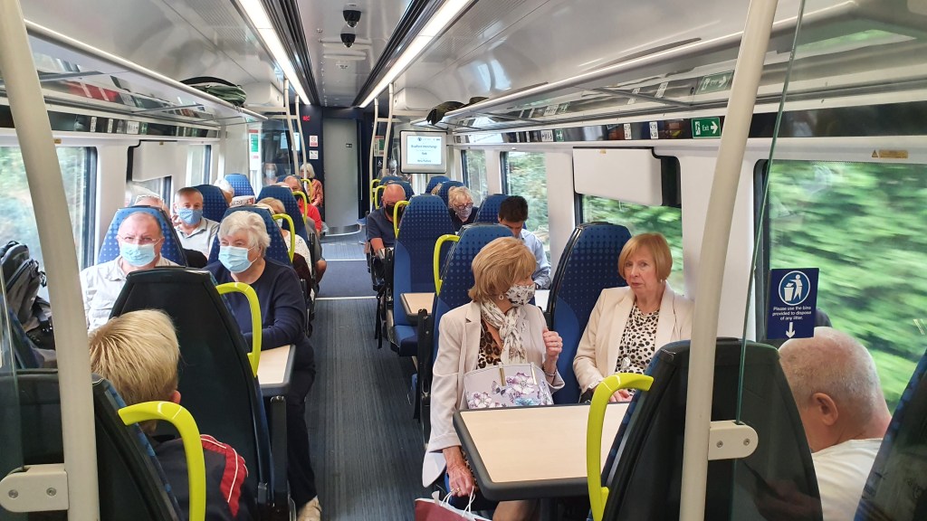 The 09:52’s worked by a 3-car Class 195 and it’s busy with people having a day out to either Leeds or York. Many of the passengers are either holidaymakers, retired (or both).