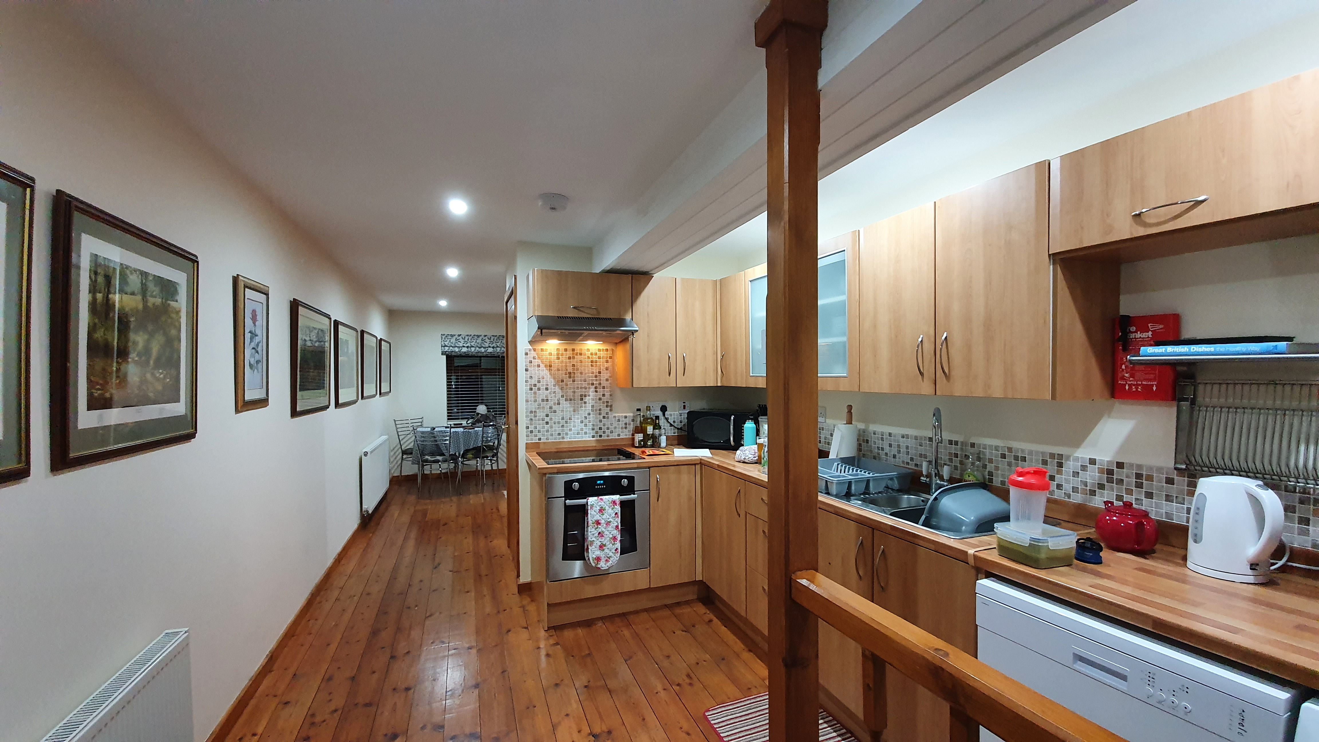 The living room and dining table, with the kitchen and entrance to the ground floor property around the corner to the left. The main bedroom is behind me with a second bedroom and bathroom off to the left.