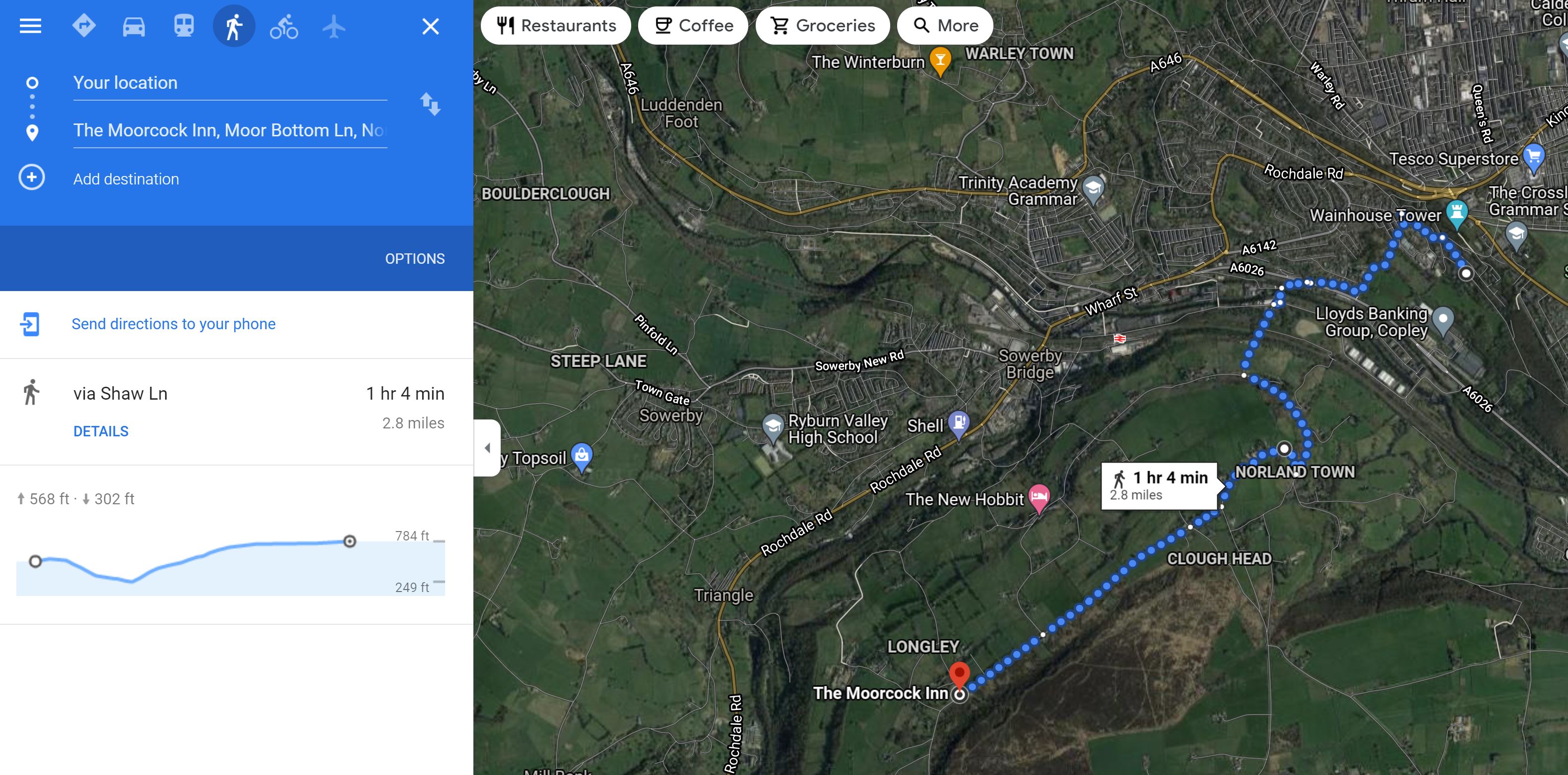 As the weather had improved we both decided to ditch thoughts of work and get out for a walk. We’ve both been chafing at being confined to the house so much – just for different reasons. Dawn’s been full-on with work as it’s the Community Rail Awards this next week and I’ve been knocked-back by a combination of the ‘lurgi’ and my Covid booster. So today we both thought ‘bugger it’ and headed out to walk up to Norland Moor and visit one of our favourite haunts – the Moorcock Inn.