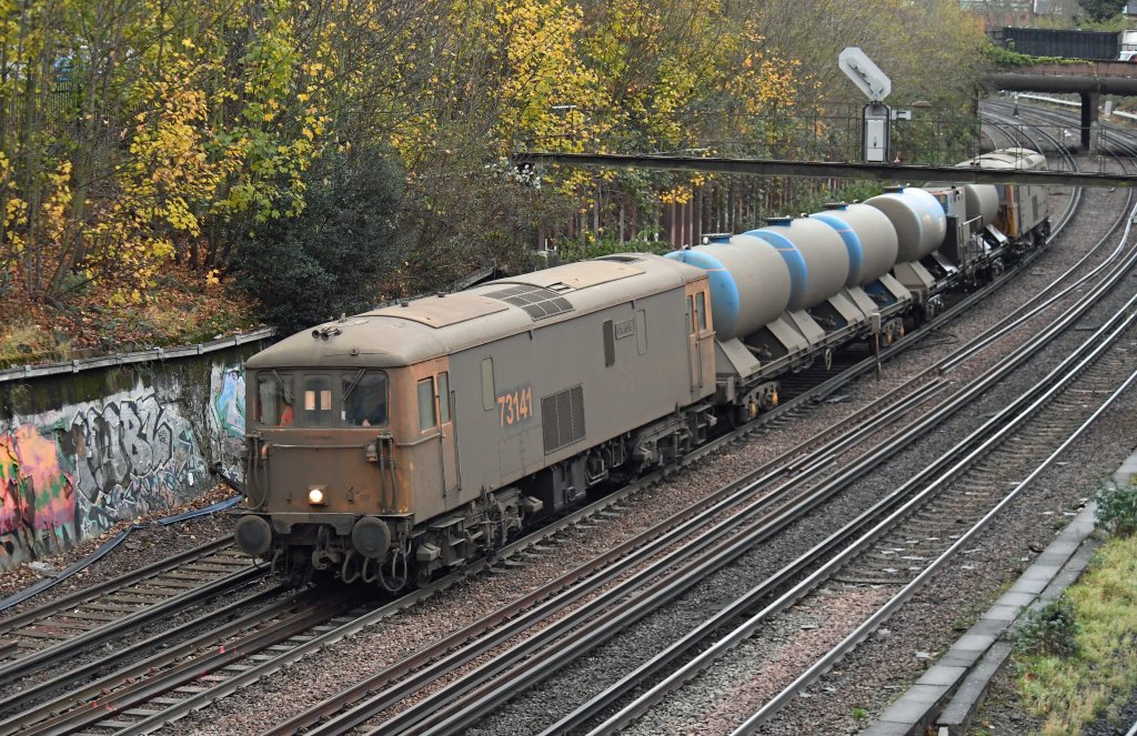 GBRf electro-diesel 73141 leads the railhead treatment train into Clapham Junction. This is a circular working as 3W90, the from 04:35 Tonbridge West Yard.