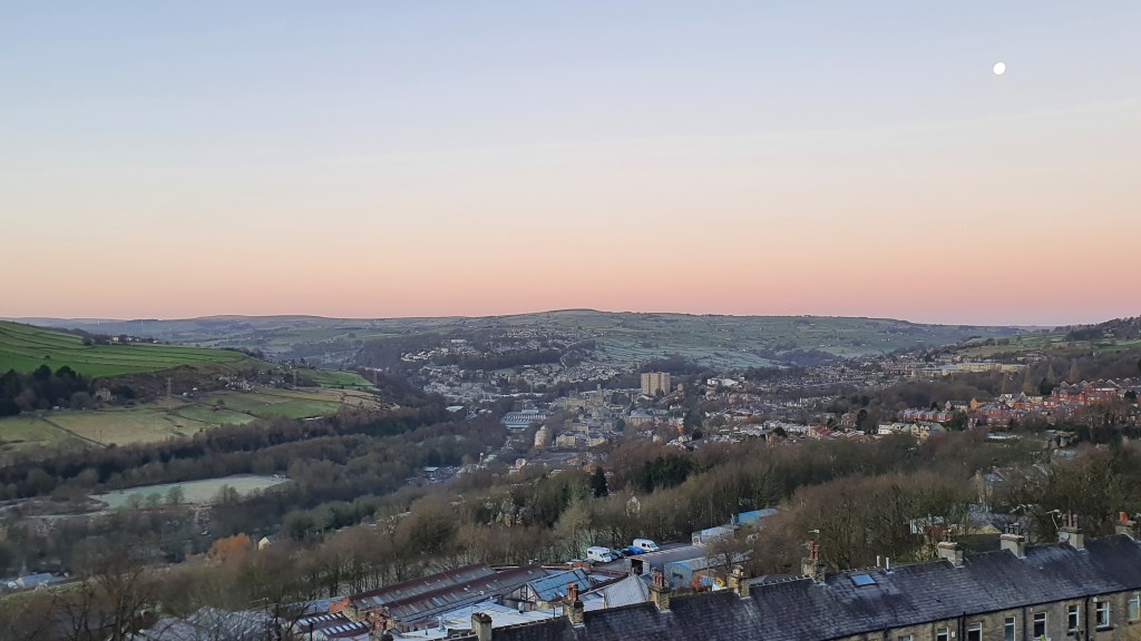 As threatened I’ve escaped the Calder valley this morning. Having packed my passport I’m heading across the Pennines to Manchester and the North-West to (hopefully) obtain some scenic railway pictures as part of a long-standing commission. The weather’s certainly ideal. We’ve a crisp, frosty morning in the valley with clear blue skies that make the ideal backdrop. Having walked up the hill towards Halifax I paused for a moment to grab this shot which illustrates what I mean. I never tire of this view and will often linger here to watch the world go by.
