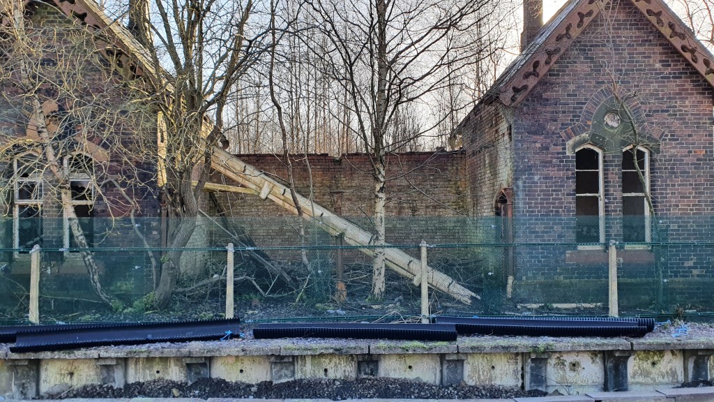 I’m now on my way back to Manchester after taking a trip down the Mid-Cheshire line to Northwich to recce a few photographic locations. Sadly, nothing stood out and what did would only work later in the year with different lighting conditions. Still, it was a chance to reacquaint myself with a line I’ve not had need to traverse for several years. I ended up in Northwich, the source of most of the UKs rock salt – a precious commodity this time of year! Ignoring the fact using such a cortosive naterial in this day and age is rather mad I was curious to see the state of the station. Part of the original building suffered a rather spectacular collapse not that long ago and it was amazing no-one was killed. Repairs are still ongoing. As a kid I remember when this place was a hive of railway activity due to mineral traffic to and from the ICI (remember them) works. Now the sidings are abandoned and overgrown with Silver Birch trees whilst the site of the locomotive depot is a housing estate.