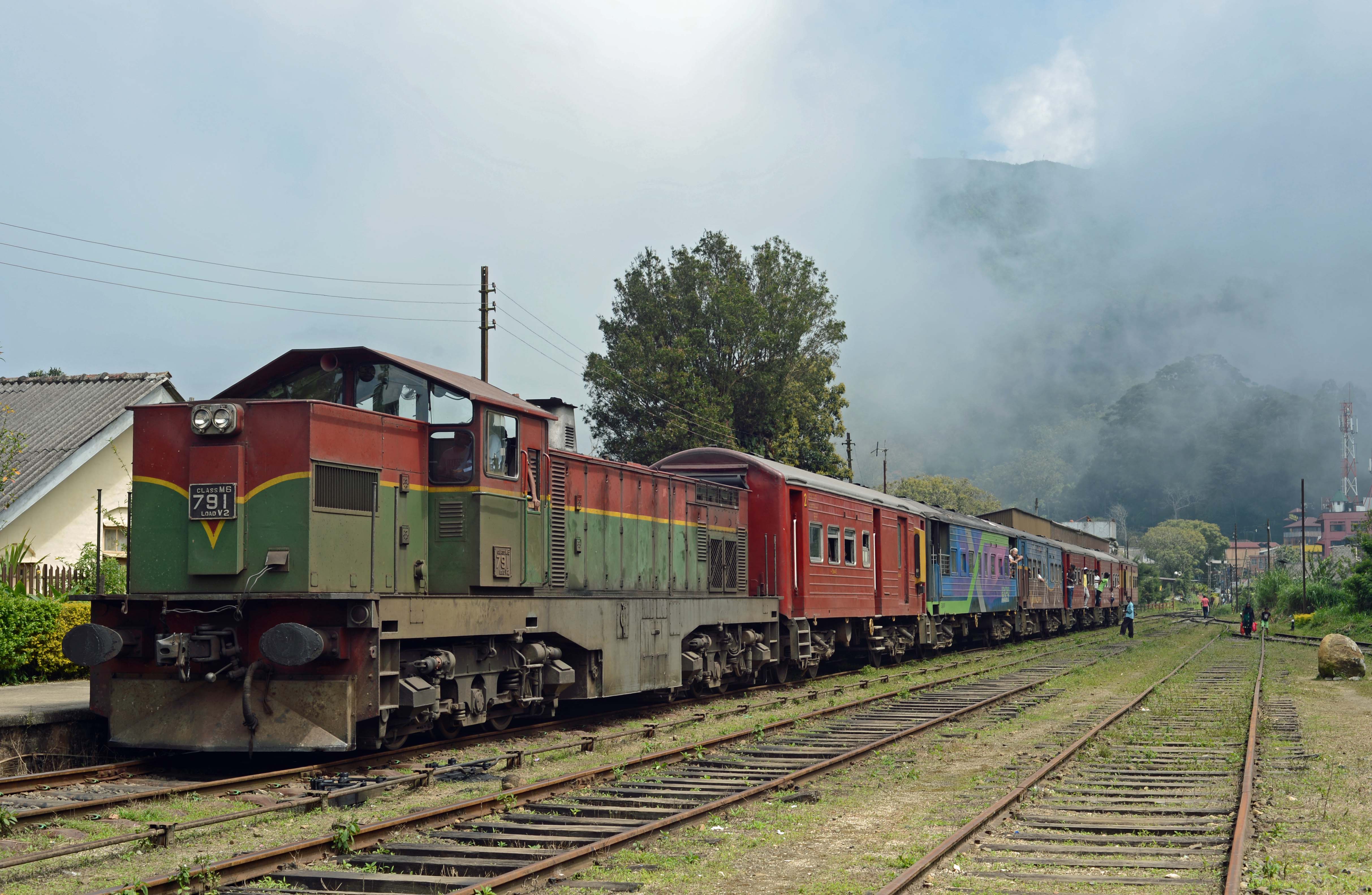 This is Haputale, in the hill country seen on the 17th January 2016. A German built diesel-hydraulic loco has called with a train from Badulla to Kandy whilst clouds swirl around the town which is perched on a ridge between two valleys 1431 meters above sea-level.