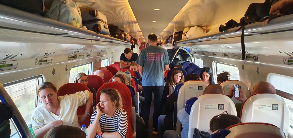 Bar the unreserved coach (C) it’s a mass of reserved setas and people milling around swapping coaches in an effort to find a seat. I’m stood in the vestibule as I gave up after trying 3 cars. Plus, I’m only going to Crewe. Here’s how F looks – and we haven’t stopped at Stockport or Wilmslow yet!